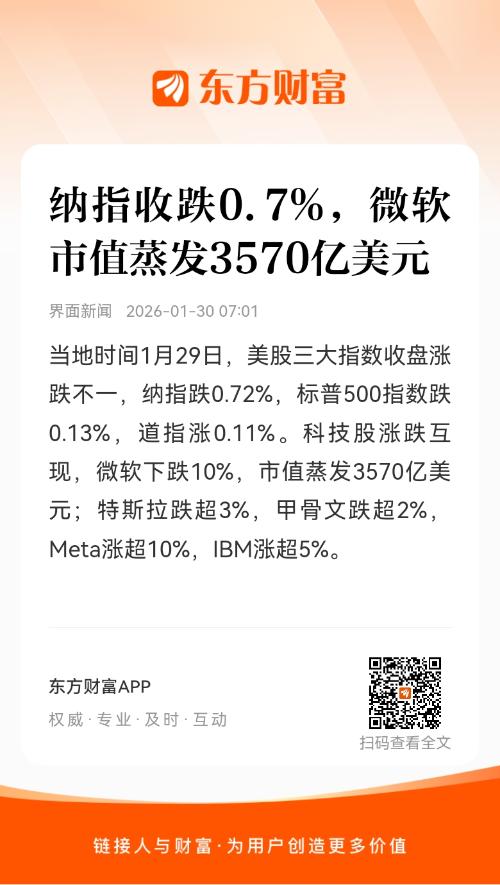 当地时间1月29日,美股三大指数收盘涨跌不一,纳指跌0.72%,标普500指数跌0.13%,道指涨0.11%。科技股涨跌互现,微软下跌10%,市值蒸发3570亿美元;特斯拉跌超3%,甲骨文跌超2%,Meta涨超10%,IBM涨超5%。