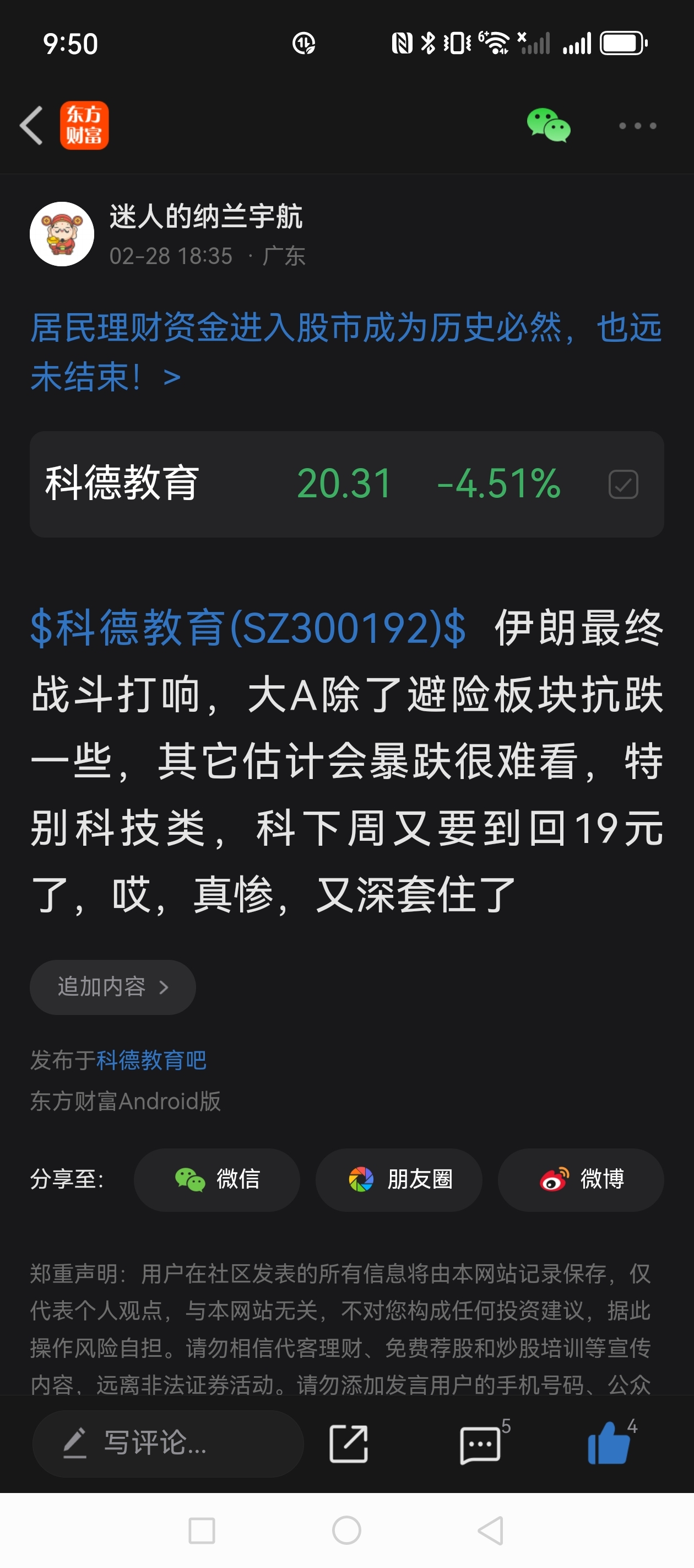 温馨提示: 1.根据《证券法》规定,禁止编造、传播虚假信息或者误导性信息,扰乱证券市场;2.用户在本社区发表的所有资料、言论等仅代表个人观点,与本网站立场无关,不对您构成任何投资建议。用户应基于自己的独立判断,自行决定证券投资并承担相应风险。《东方财富社区管理规定》