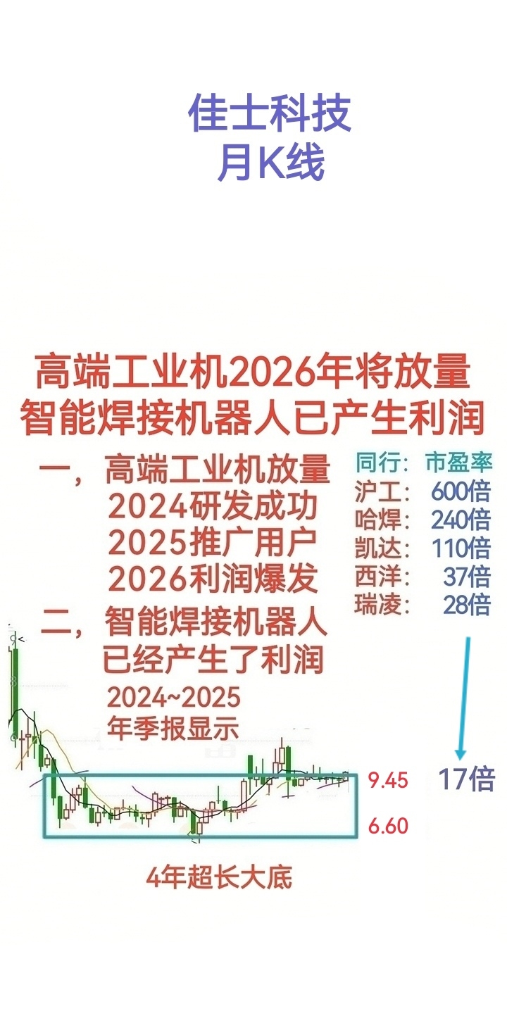 小科技,业绩第一估值垫底,4年超长大底,涨幅是创指的三分之一,涨幅是同行的15~50%,智能焊接机器人已产生利润。
