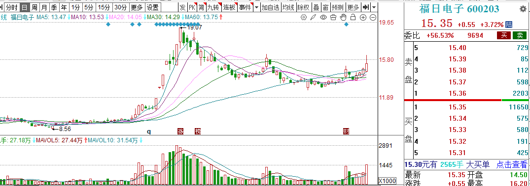 看好它主要是两个方面,一是良好基本面,公司是华为核心供应商,在消费电子板块中辨识度还是比较高的,在三季报中营收和净利润都是大幅增长。第二个就是它是福建地方国企,海峡西岸板块是目前最热板块之一,目前行情还没有退潮迹象。福日电子最为本地国企,本轮行情明显是落后了,后市有补涨需求的。