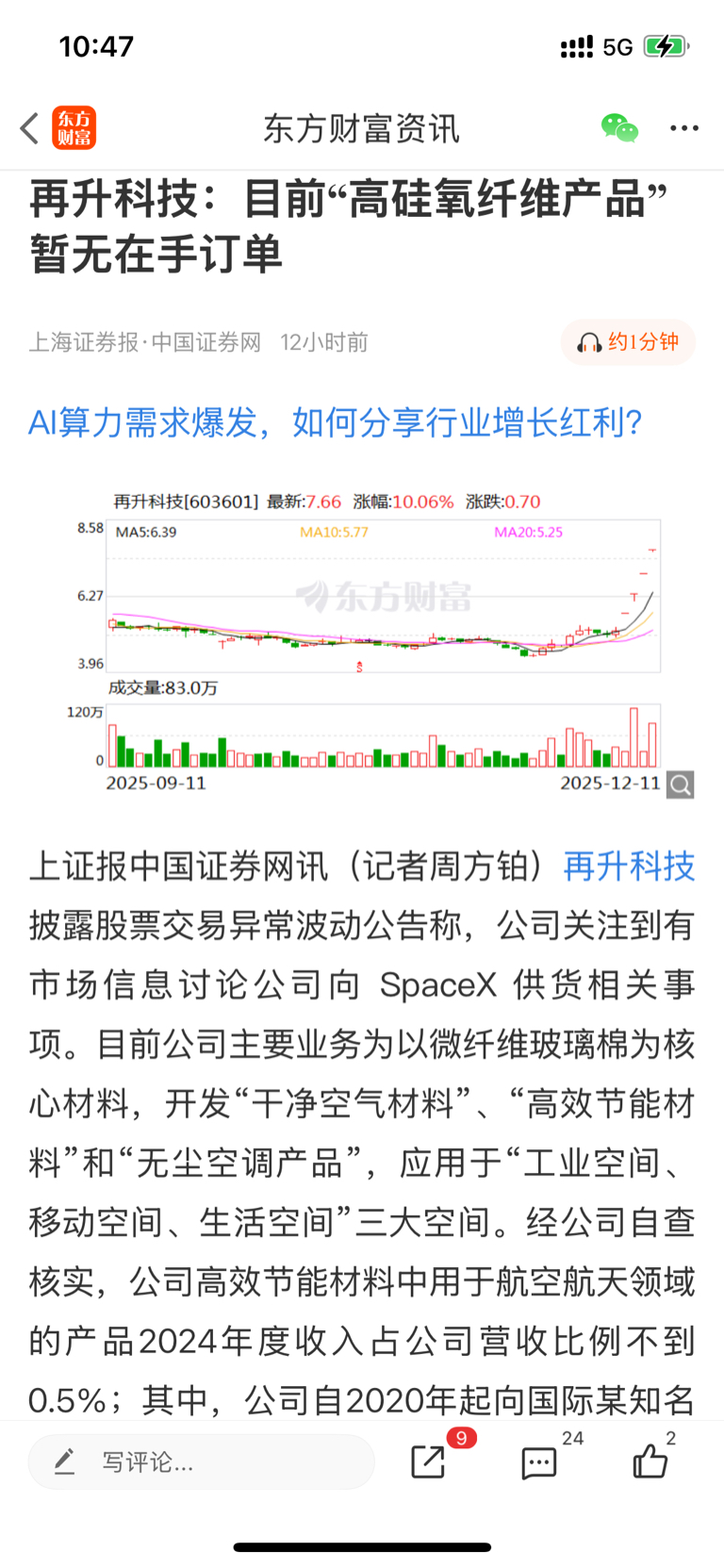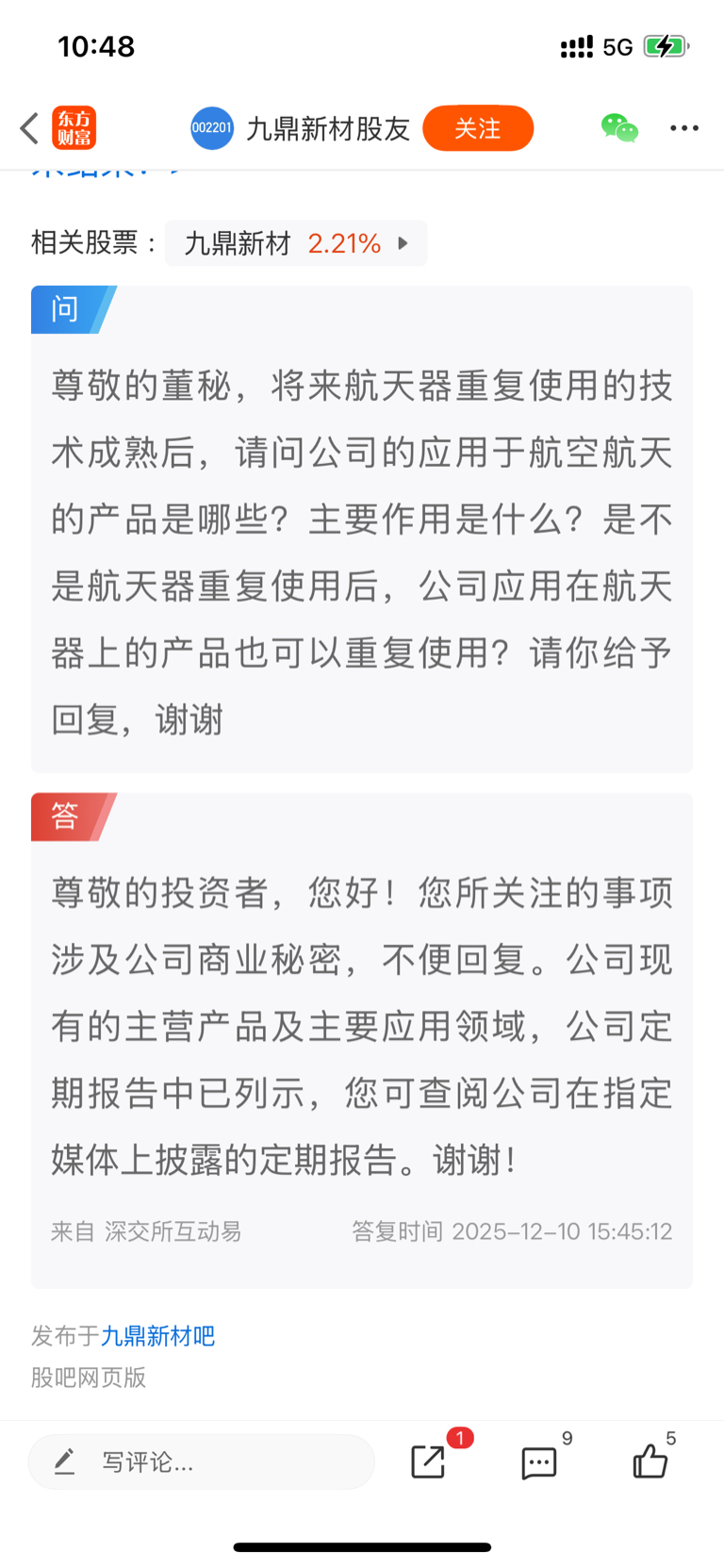 $长海股份(SZ300196)$ $再升科技(SH603601)$ $九鼎新材(SZ002201)$ 603601再升科技,就是生产的高硅氧纤维(就是玻璃纤材复合材料的一个分支种类),应用于马斯克的星链,而连续涨停;九鼎新材公司互动,此地无银三百两。