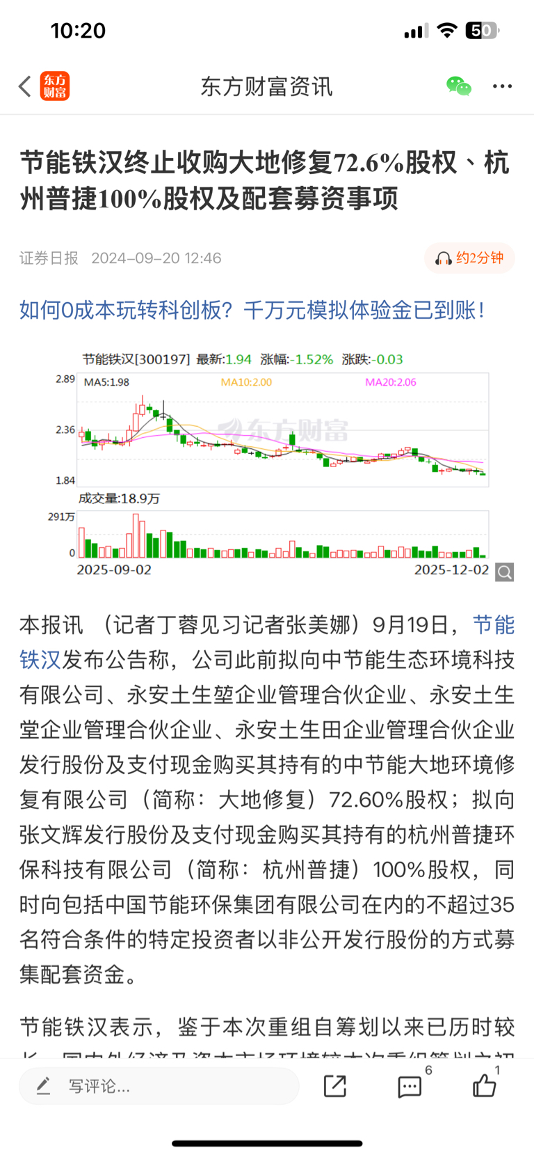 $节能铁汉(SZ300197)$ 刚终止重组的,这段时间大概率都不会再有重组饿大动作,借款29亿跟判决的代收款29亿相同,说明中节能集团对于回收款很有信心。庄家继续洗盘吧。暴力洗盘。