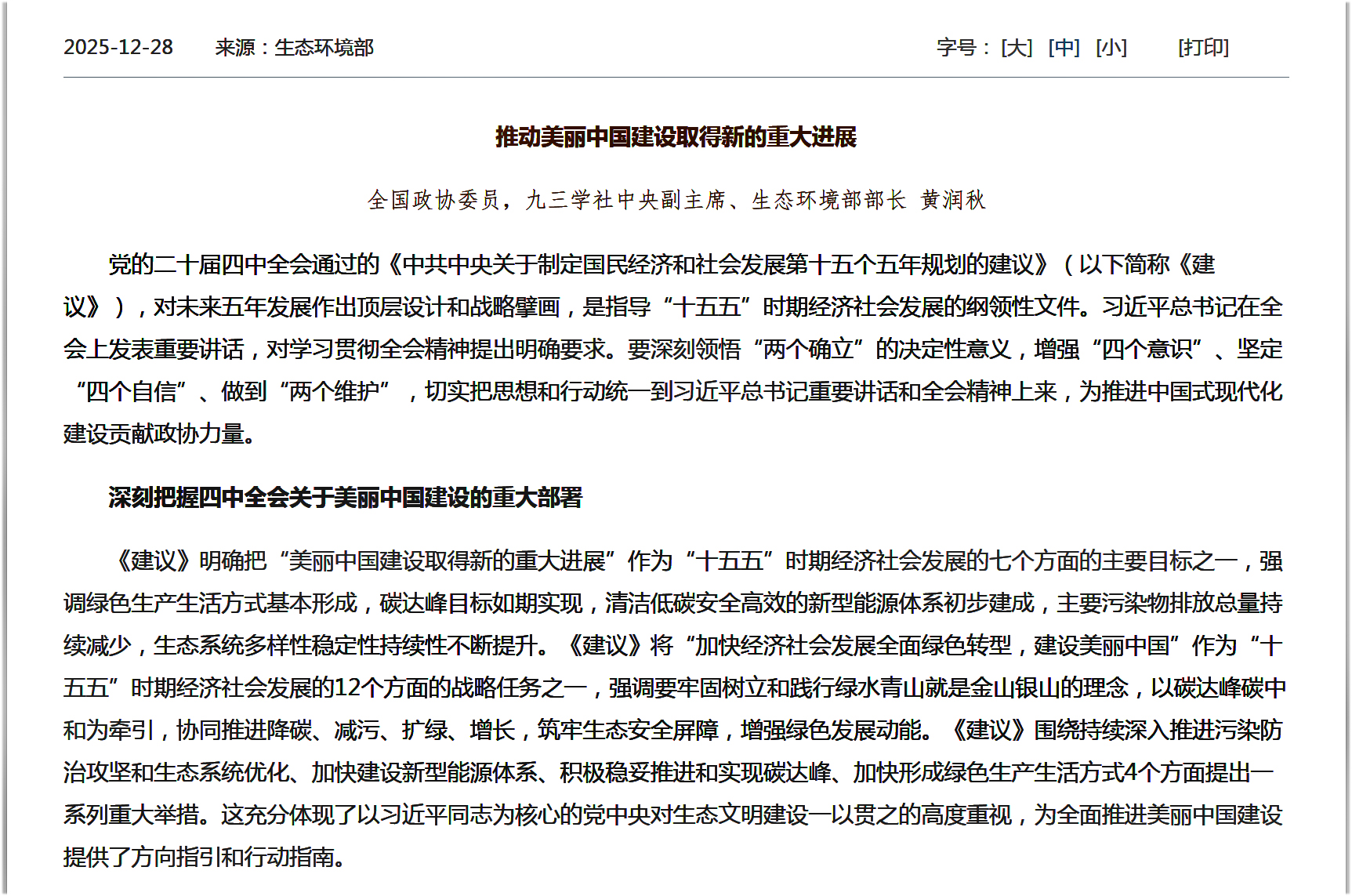 生态环境部部长:《 推动美丽中国建设取得新的重大进展 》