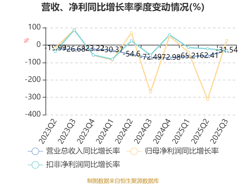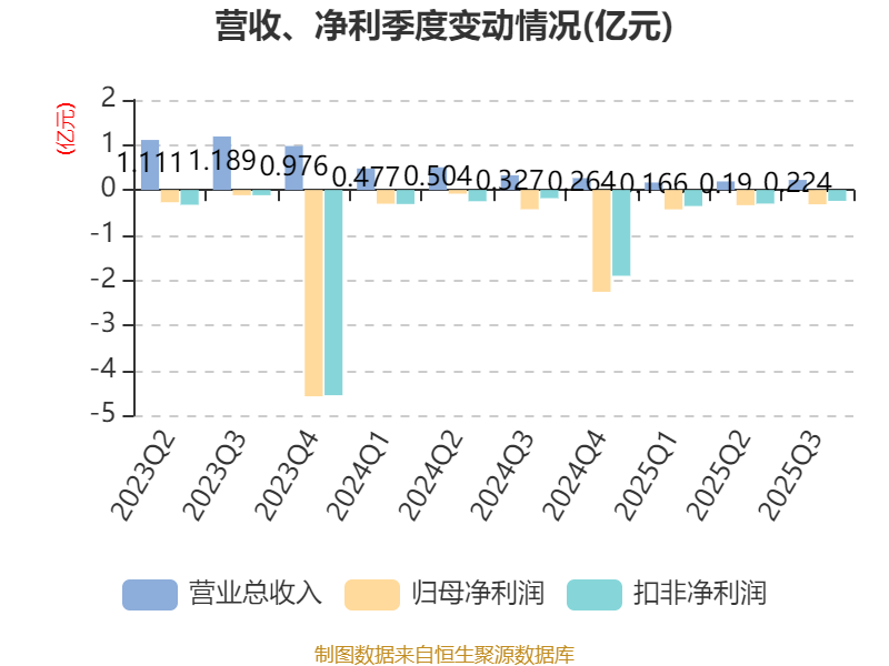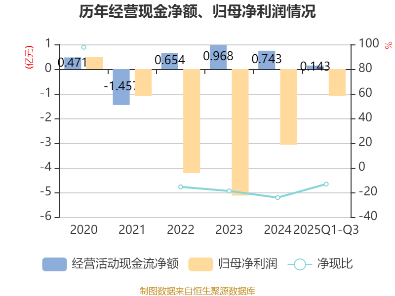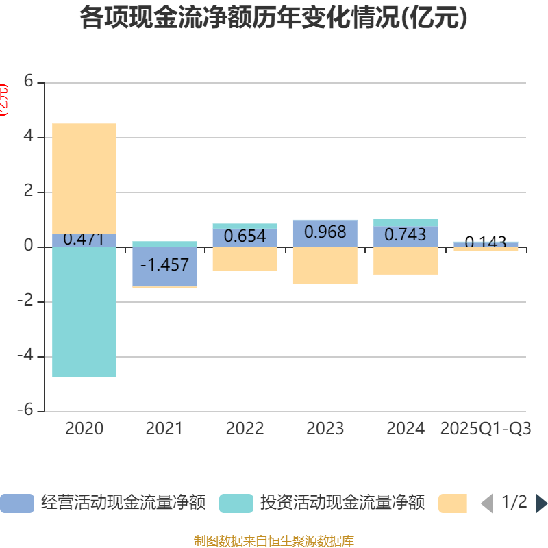 2025年前三季度,公司经营活动现金流净额为1434.28万元,同比下降82.42%;筹资活动现金流净额-1515.12万元,同比增加7951.76万元;投资活动现金流净额360.23万元,上年同期为1360.95万元。