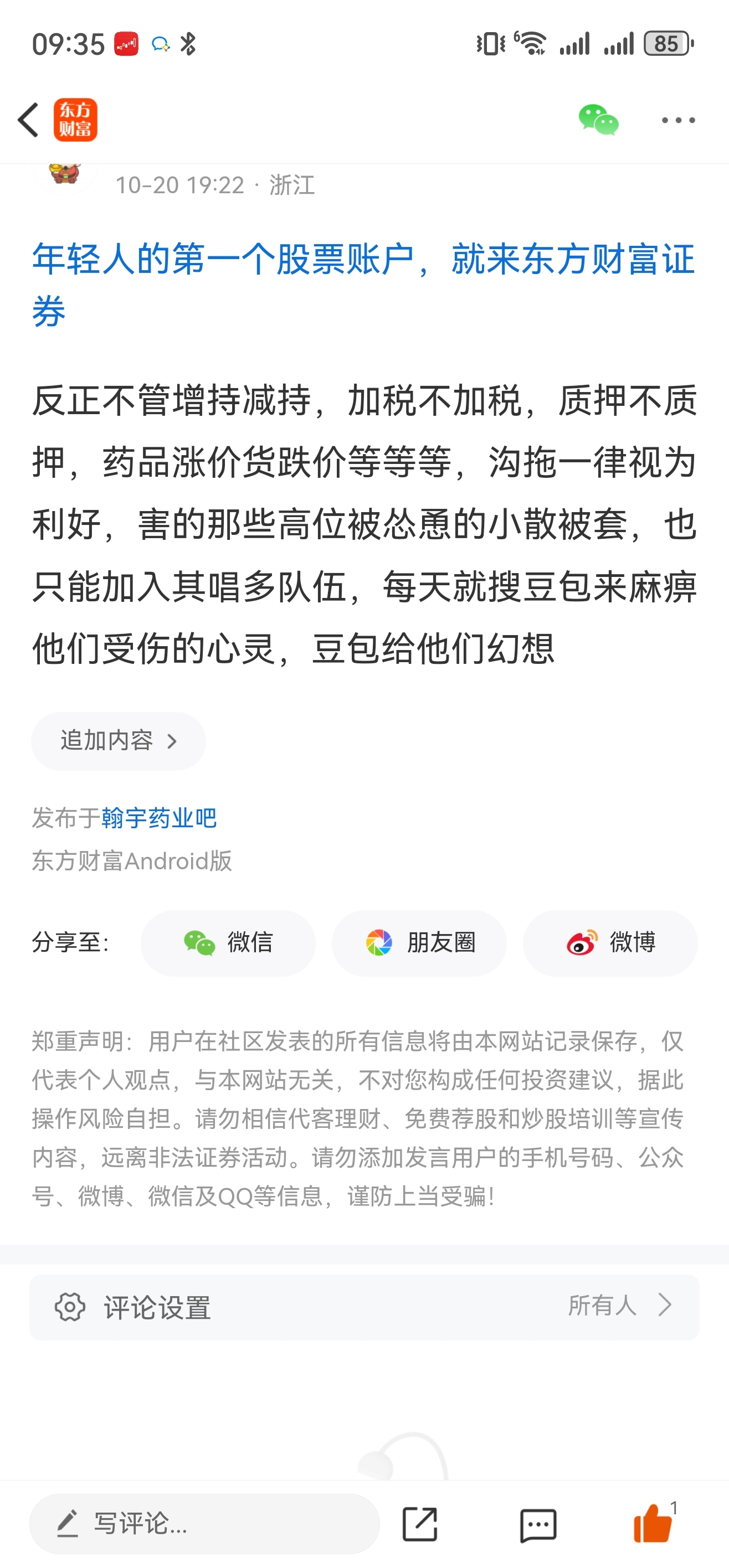温馨提示: 1.根据《证券法》规定,禁止编造、传播虚假信息或者误导性信息,扰乱证券市场;2.用户在本社区发表的所有资料、言论等仅代表个人观点,与本网站立场无关,不对您构成任何投资建议。用户应基于自己的独立判断,自行决定证券投资并承担相应风险。《东方财富社区管理规定》