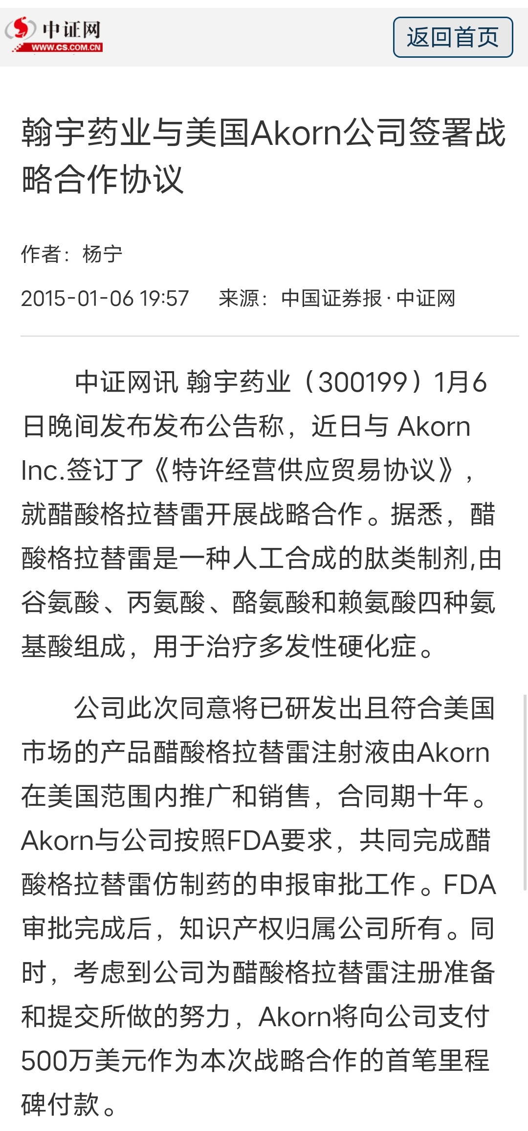 $翰宇药业(SZ300199)$ 翰宇跌的娘没了,只剩爹了!A杀了三四个月了,在这种A杀情况下还不少托良心坏了,在吧里唱多散布一些10年前的好消息。比如,从2015年起说了10年的与美国Akorn公司签署战略合作协议的事情。