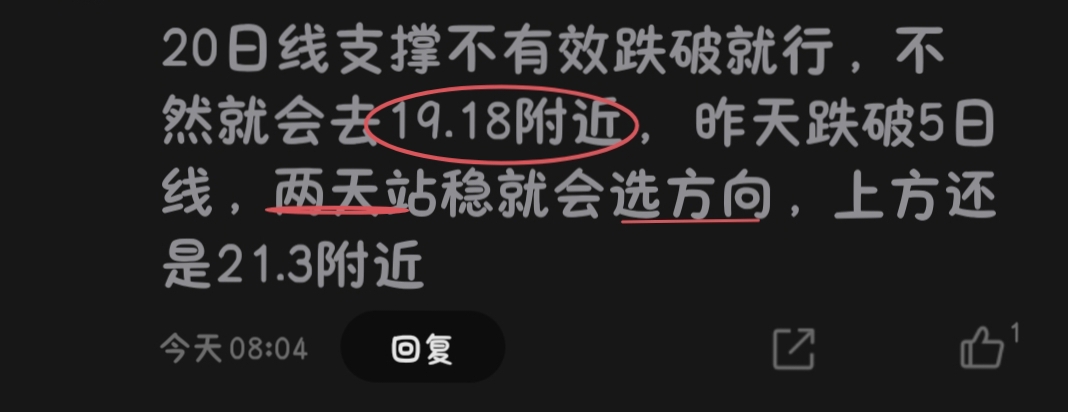 跌破20日,19.18附近会停一停,下午看19.6附近能不能守住,两天站稳20日