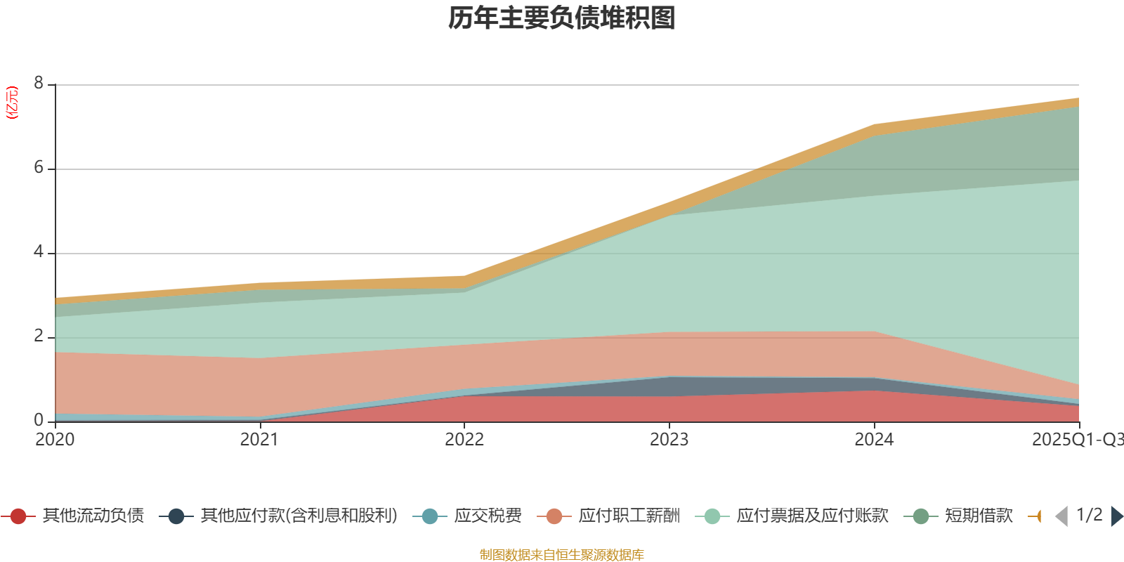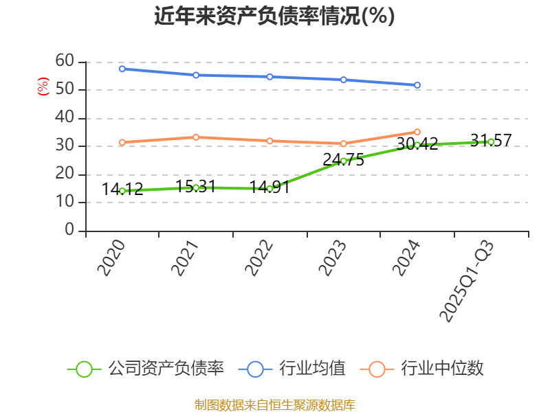 负债重大变化方面,截至2025年三季度末,公司应付票据及应付账款较上年末增加50.74%,占公司总资产比重上升6.06个百分点;应付职工薪酬较上年末减少68.11%,占公司总资产比重下降3.27个百分点;其他流动负债较上年末减少50.01%,占公司总资产比重下降1.66个百分点;其他应付款(含利息和股利)较上年末减少83.79%,占公司总资产比重下降1.08个百分点。