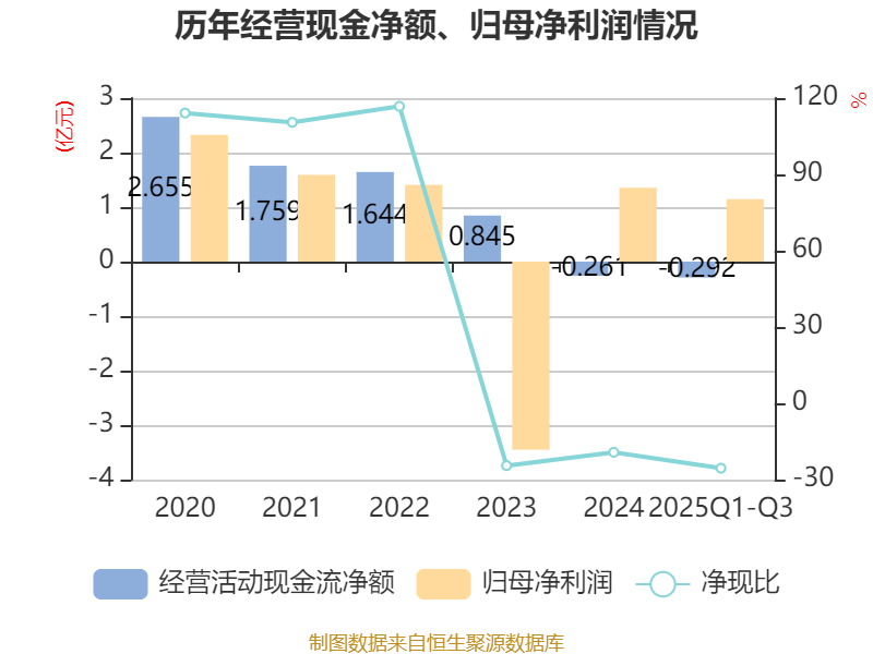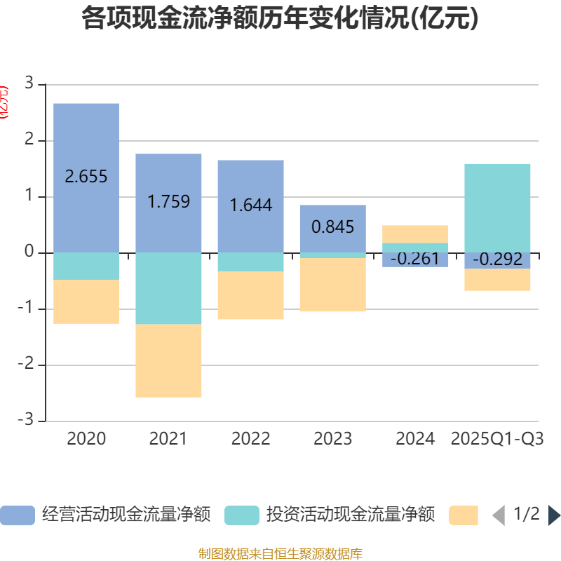 2025年前三季度,公司经营活动现金流净额为-2920.37万元,同比减少2949.19万元;筹资活动现金流净额-3917.99万元,同比减少1.49亿元;投资活动现金流净额1.58亿元,上年同期为-8812.1万元。