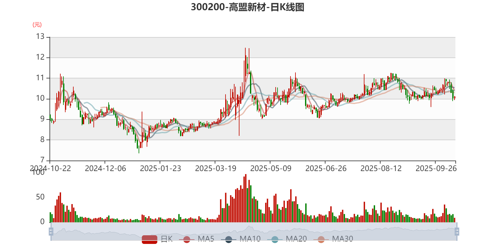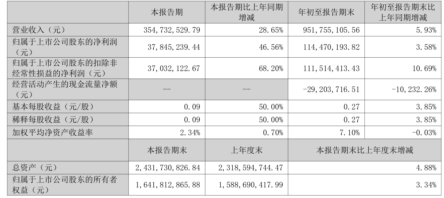 中证智能财讯高盟新材(300200)10月22日披露2025年第三季度报告。前三季度公司实现营业总收入9.52亿元,同比增长5.93%;归母净利润1.14亿元,同比增长3.58%;扣非净利润1.12亿元,同比增长10.69%;经营活动产生的现金流量净额为-2920.37万元,上年同期为28.82万元;报告期内,高盟新材基本每股收益为0.27元,加权平均净资产收益率为7.10%。