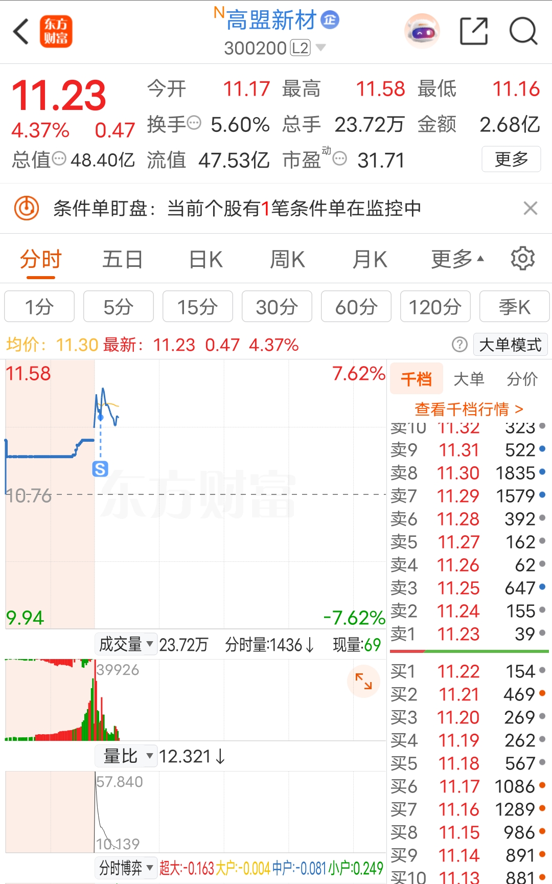 $高盟新材(SZ300200)$ 后悔11.5没有卖,卖在低点。这情况,明天大概仍然要绿开。