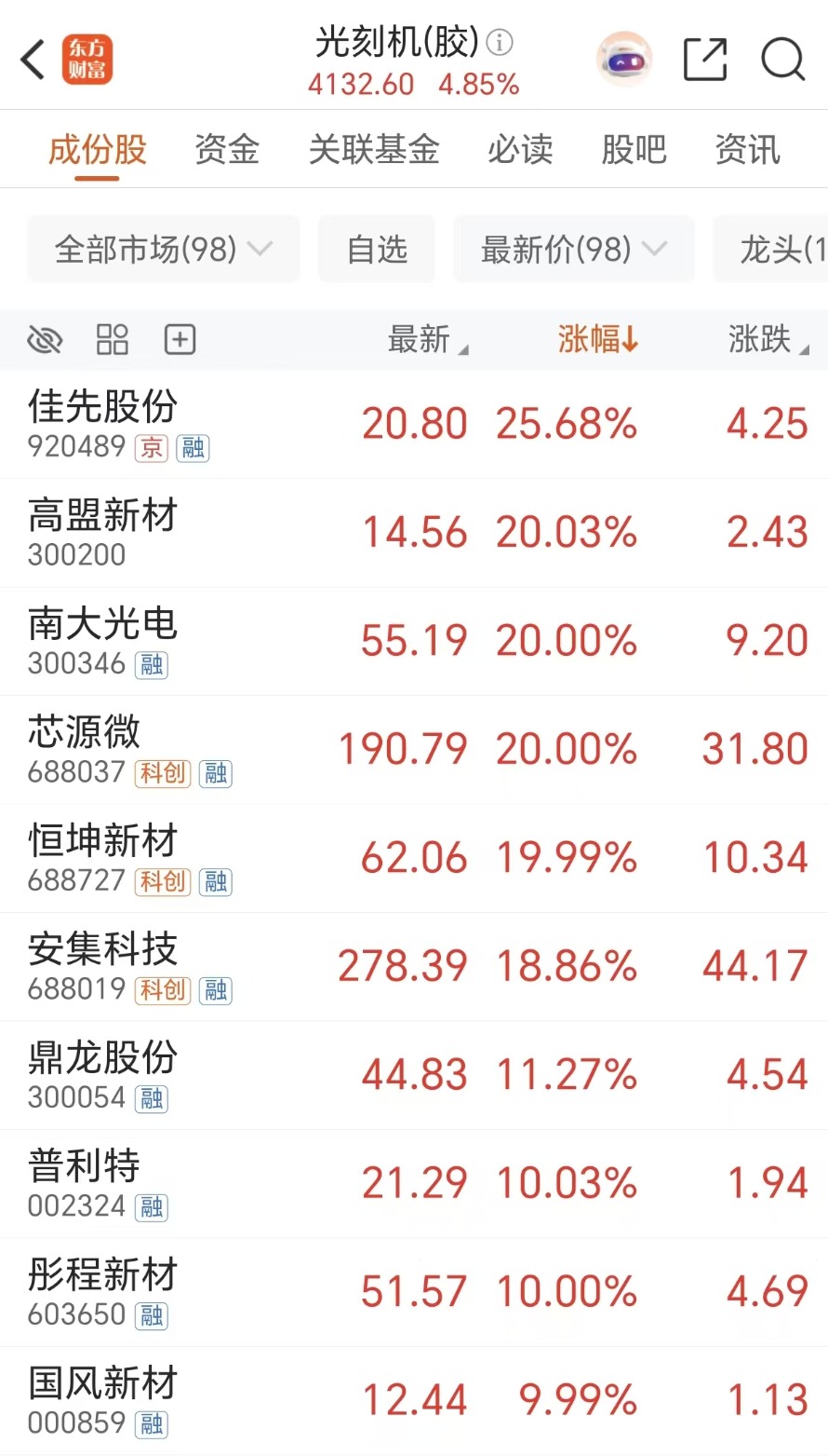 光刻机概念:20CM狂潮周三光刻机概念也火了,个股方面,高盟新材、南大光电、芯源