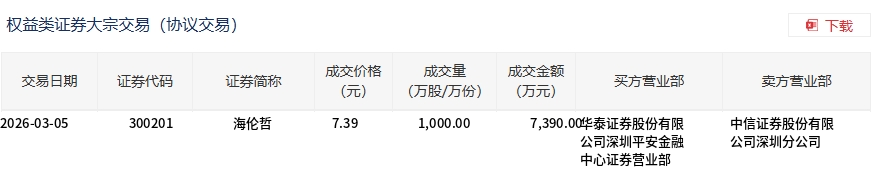 海伦哲今日大宗交易折价成交1000万股,成交额7390万元