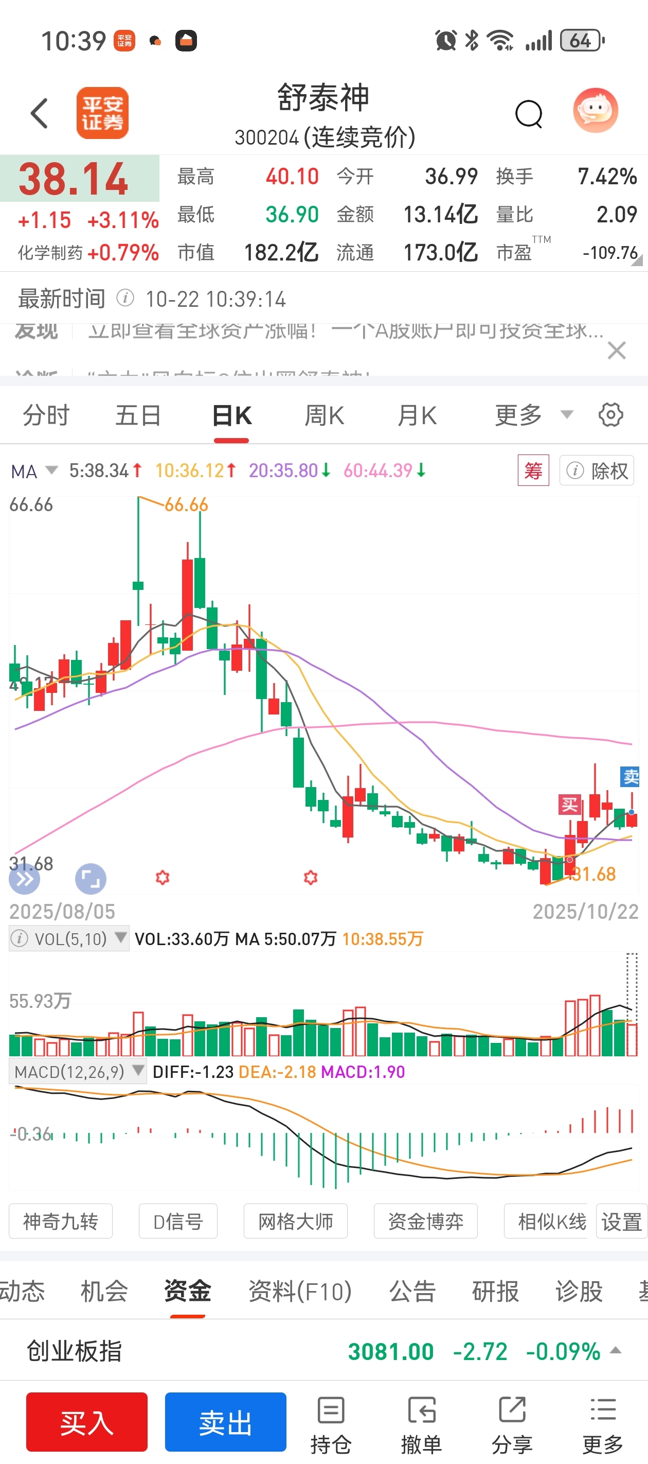 $舒泰神(SZ300204)$ 清仓了,34买的,38.3全清了。换长芯,