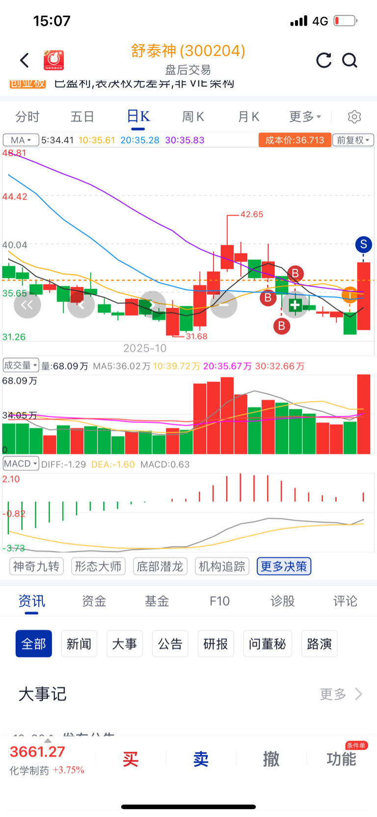 $舒泰神(SZ300204)$  两层仓位,38块进来的。一路跌一路补,昨天把仓位补满了,从两层仓到满仓单调这一支。谁能懂前期一路跌一路补的煎熬啊
