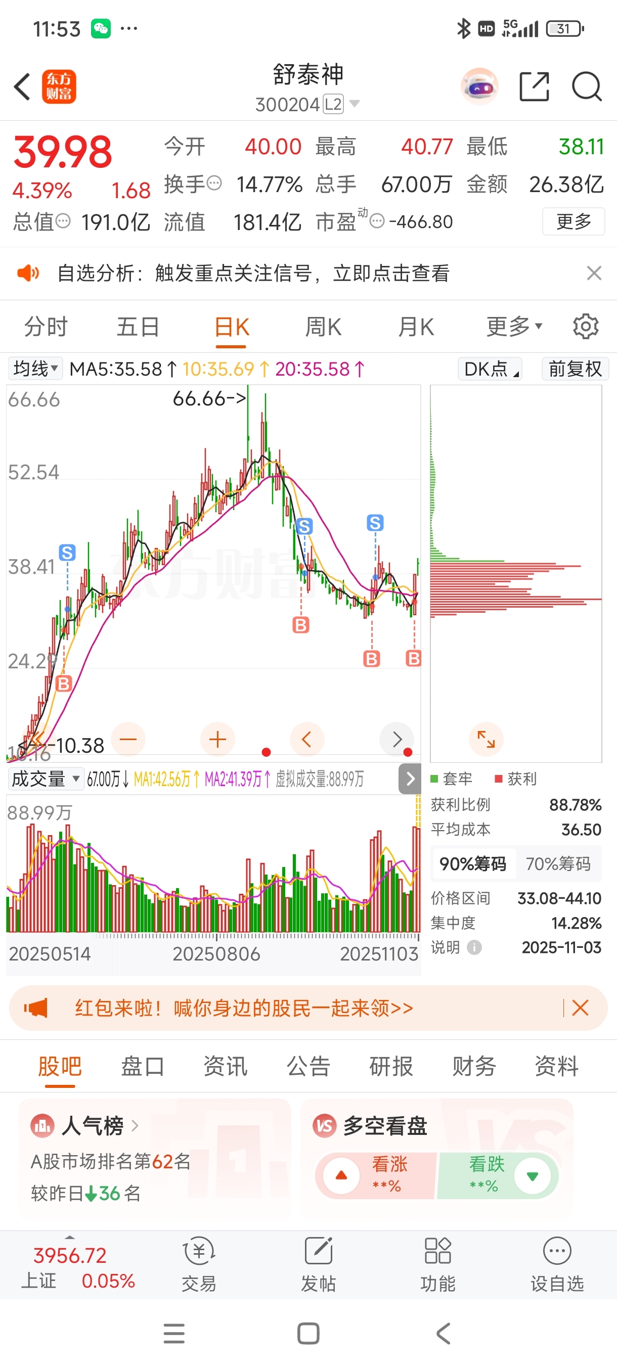 $舒泰神(SZ300204)$ 上一次33进的我错过了翻倍 这次我还是33进的 我不想再失去你了 啊舒