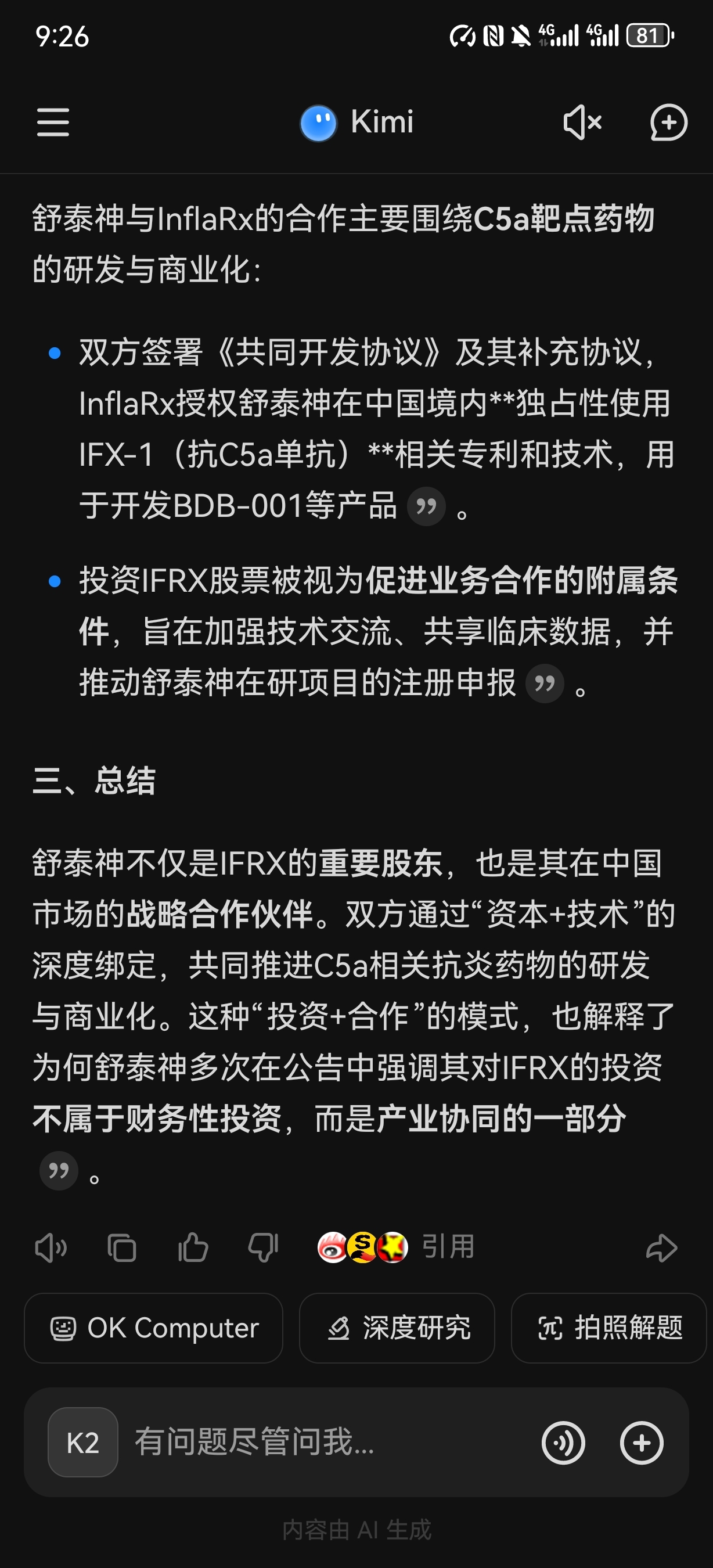 同时查了了Deepseek和Kimi,资料大概如下。之前还真不知道舒泰神还有这方
