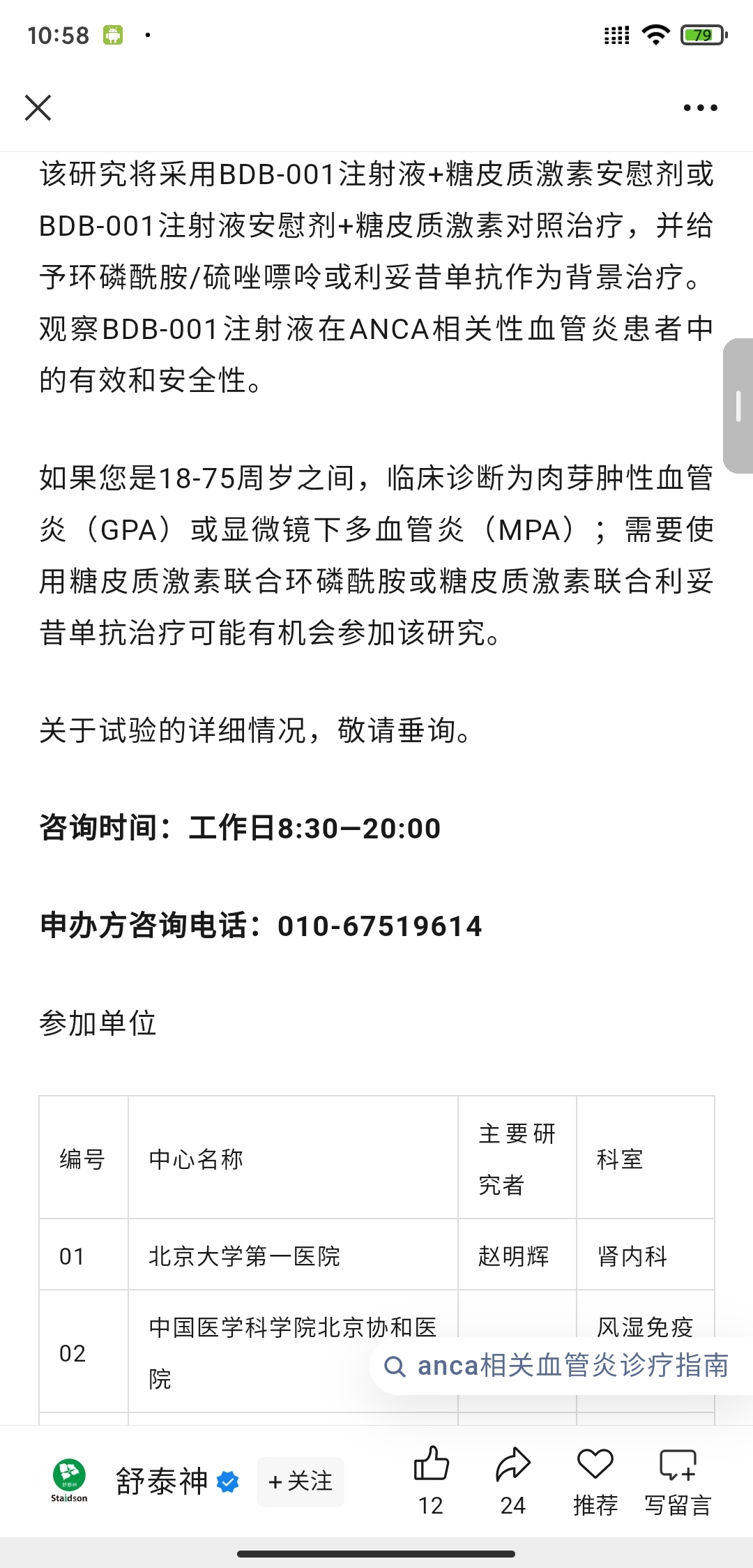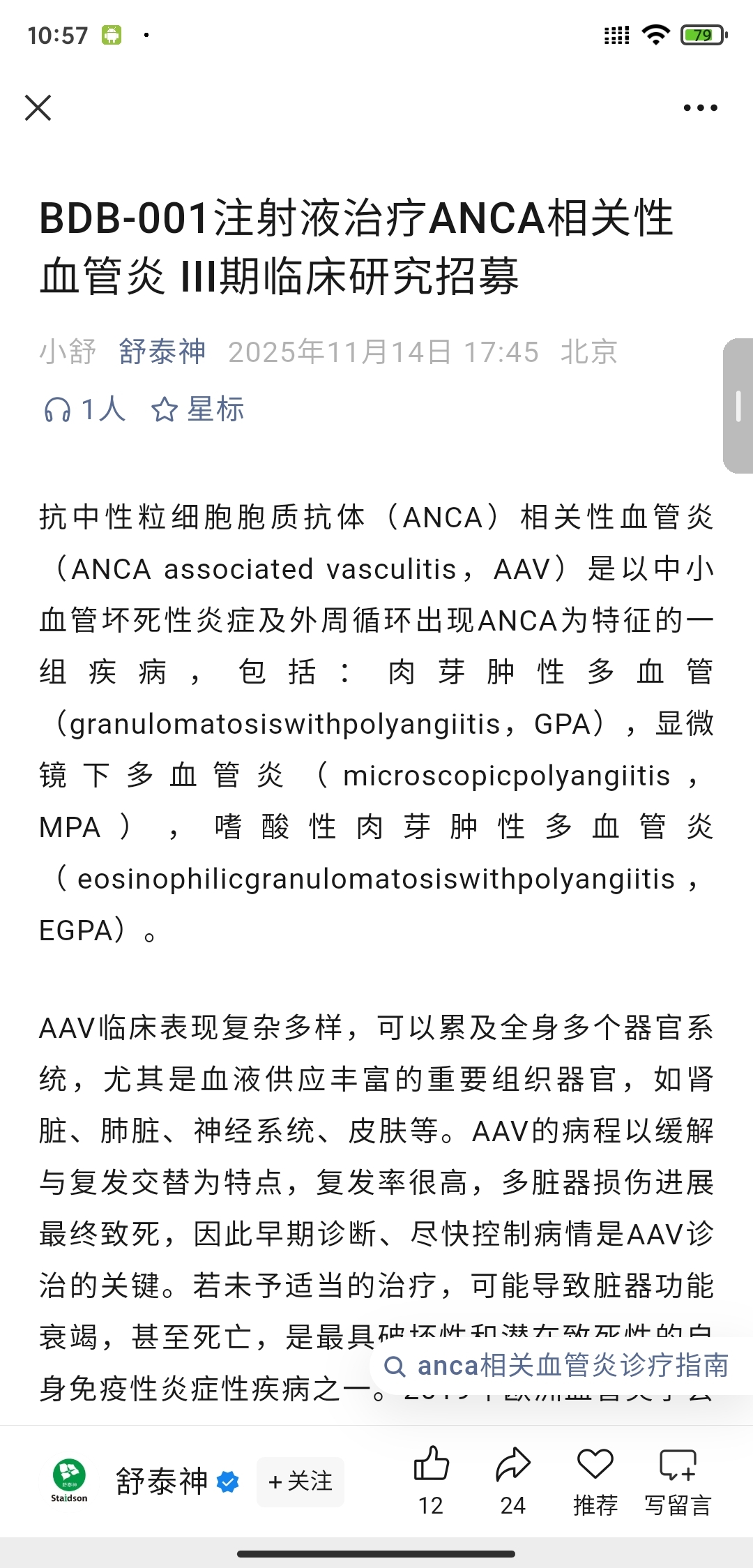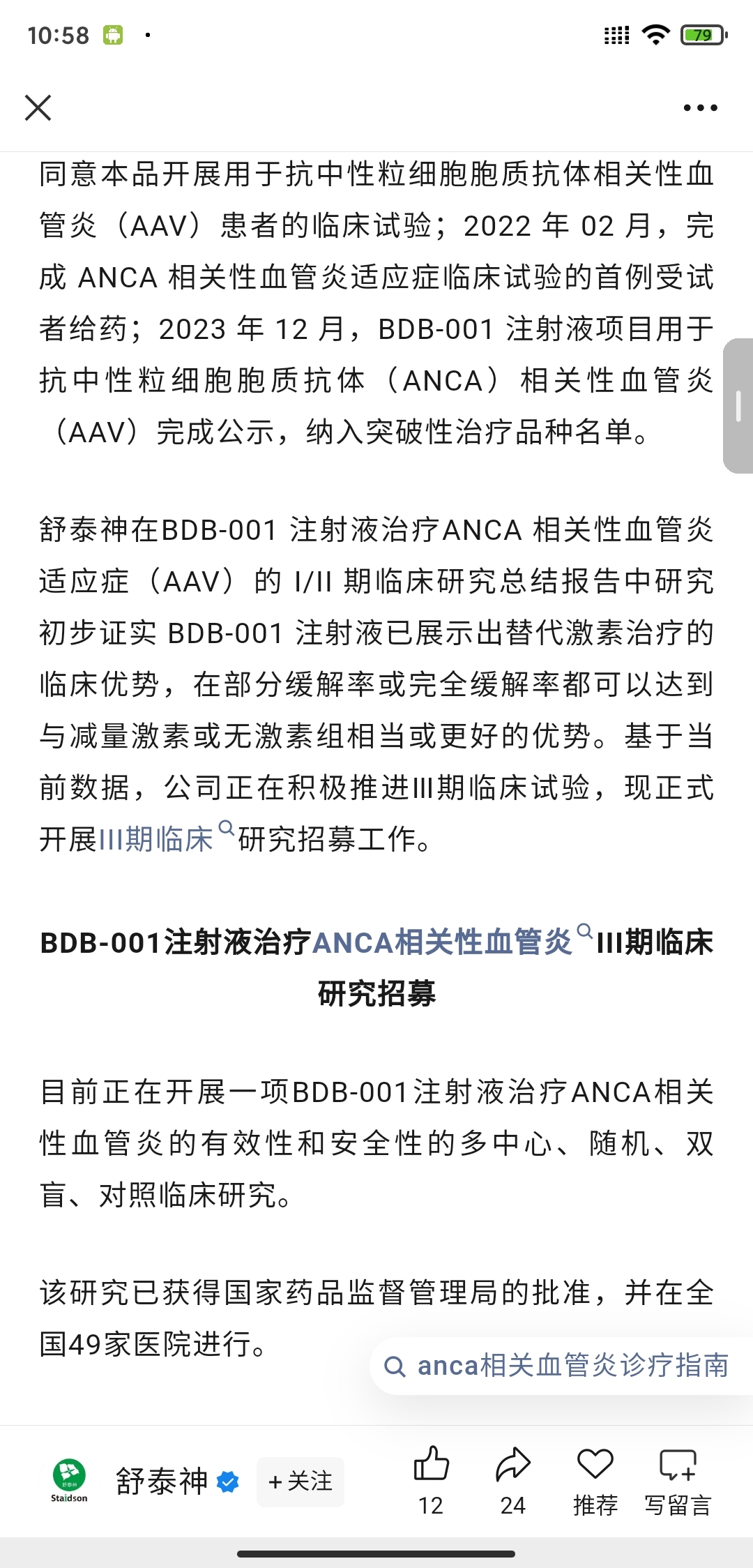 BDB-001注射液治疗ANCA相关性血管炎III期临床研究招募