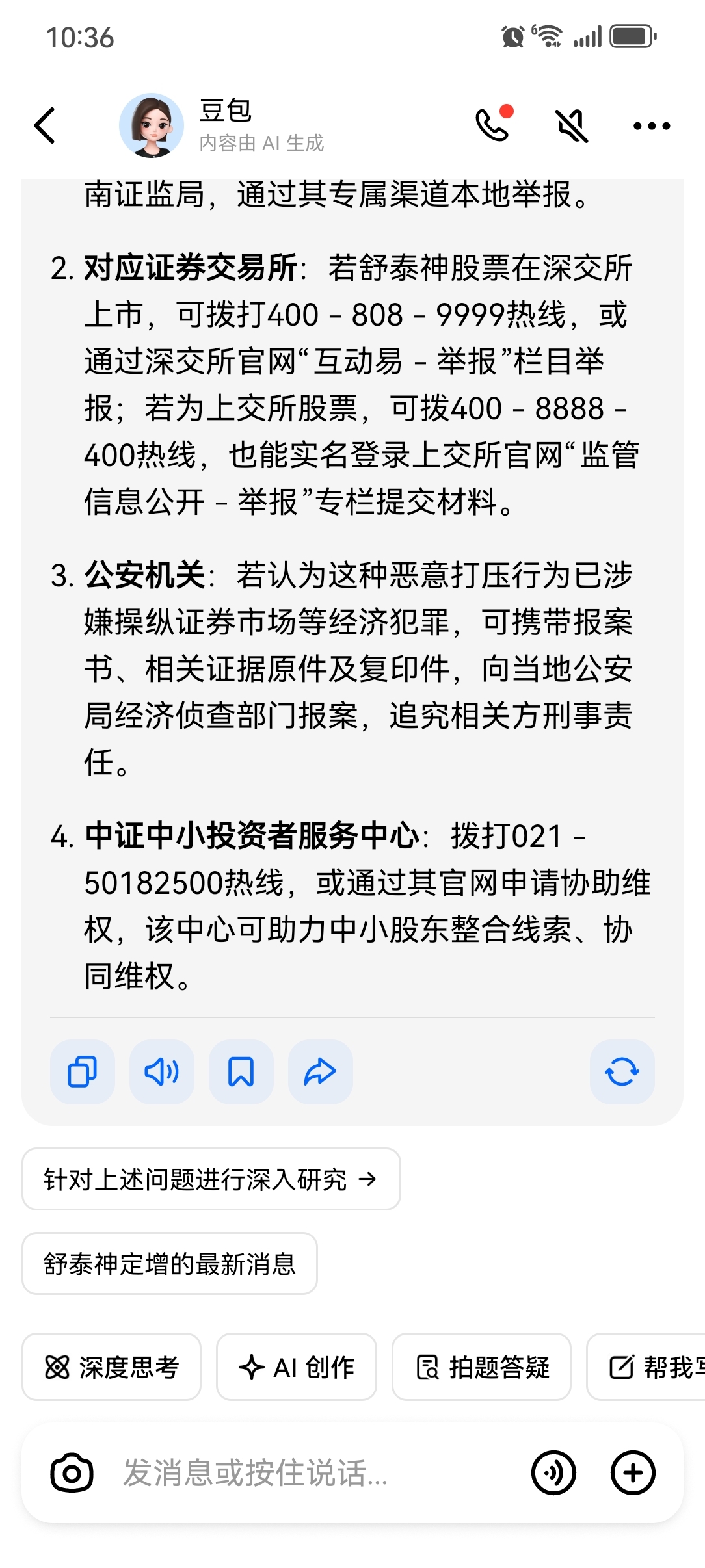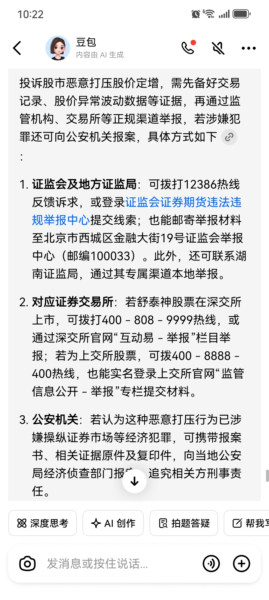 $舒泰神(SZ300204)$ 公司找主力恶意打压股价,亏了我们认亏,但是不能让公司那么好过,都去打电话投诉,哪怕没证据,一人一个电话都能让监管部门管一管,咱亏了钱,也把公司定增给搅和黄了去,互相伤害!都去试试,别傻傻的总觉得亏钱了就是自己不行,这样坑害散户的公司就是要严惩!