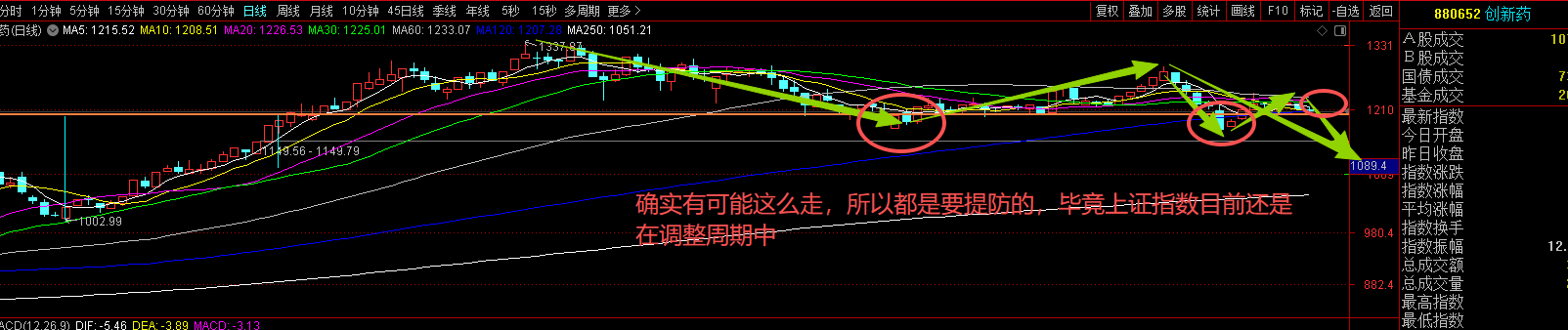 为什么我前几天说创新药在半年线这个位置是有可能调整结束的,2次跌破我的多空线都在3天内起来了。第三次面临这样的状况。虽然C段时间周期可能没到,但是空间差不多到位了,加上目前所有均线都搅在一起了,很有可能出现变盘的可能。假如启动成功那必须是往前高去的。当然目前受制于外围情况不稳,上证指数还是继续在调整中的,也不排除继续走C-3的可能跟。这个就比较难受了,下面就是缺口跟年线所在位置了。小舒跟板块基本都是同时调整的,调整的幅度小舒确实是比板块大多了。现在唯一的期盼就是板块能稳住向好,否则一点希望都看不到了。本来今天的短线资金应该是往食品创新药来的,但是看不到