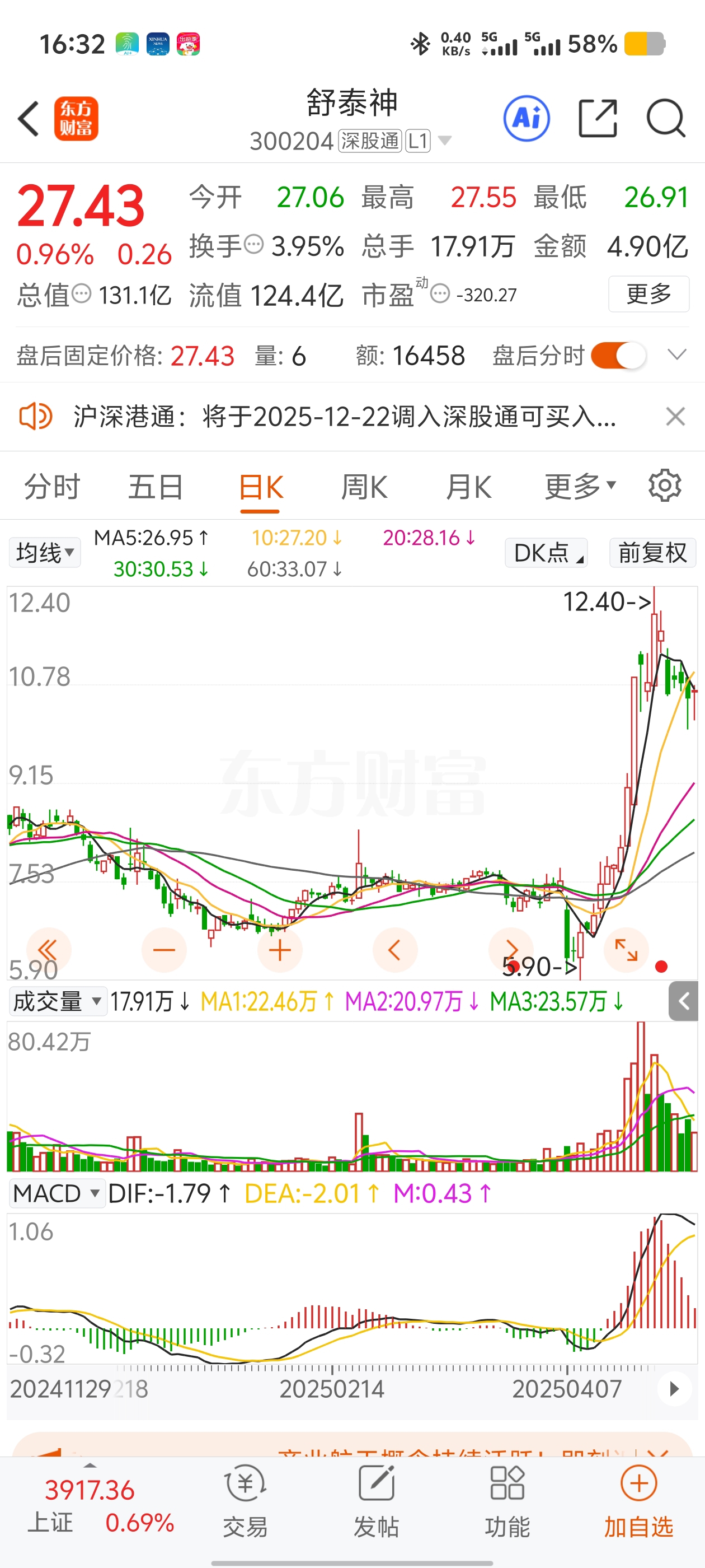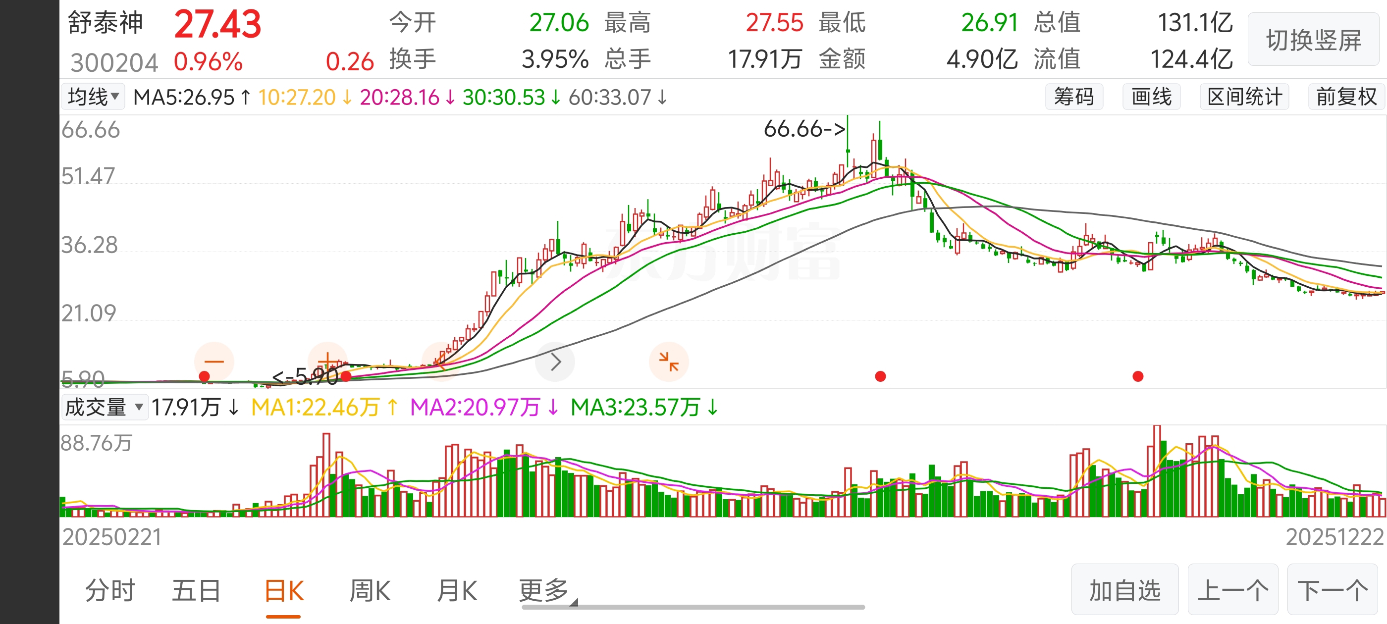 $舒泰神(SZ300204)$ 现在的股价等于都回到了 5 月份那时候多块,从 5 块多一直上涨到 66 块最高点,也是涨了 10 倍,但是从 66 又很快的回到了 20 多,这就是漫长的下跌呀,从高点到现在已经有几个月了。其实,跌破那个 60 日线,可能就是一个生命线。跌了 60 日线之后没有重新反弹,就再也没办法。