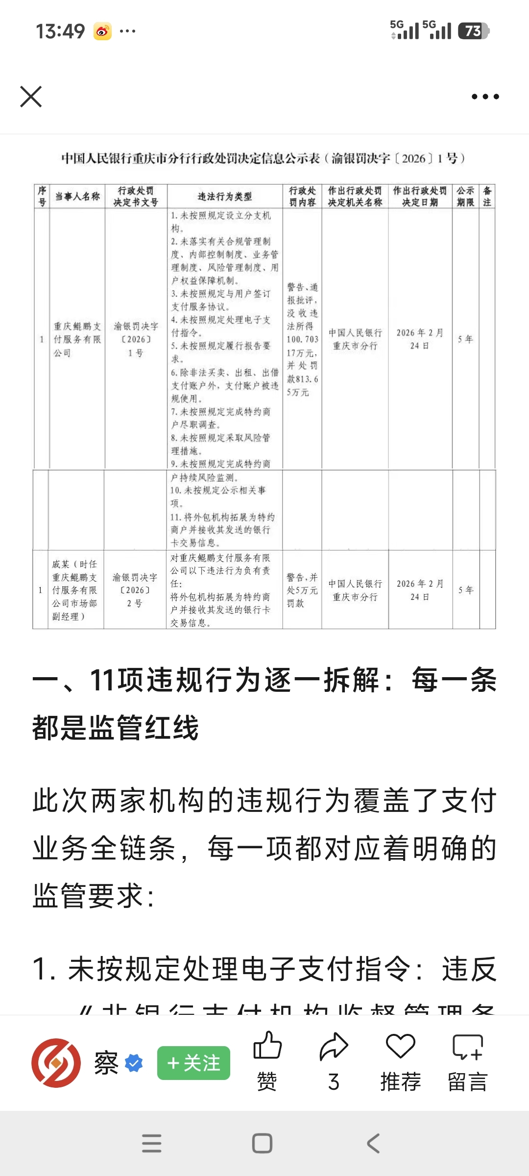鲲鹏支付再次被罚,期待尽快剥离,退股并要求其赔偿
