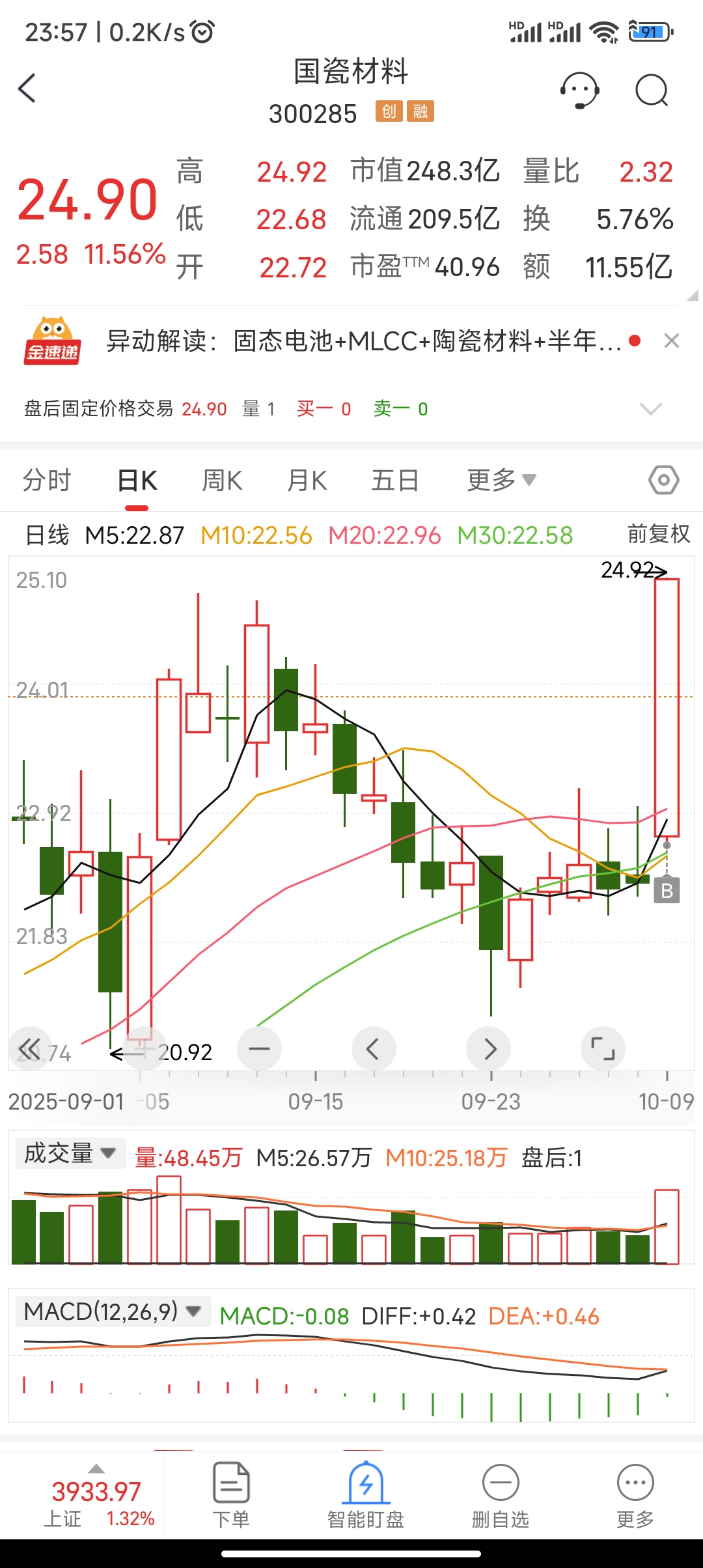 参考国瓷材料,连续三天向上洗盘。今天国瓷材料先动,就先打了。