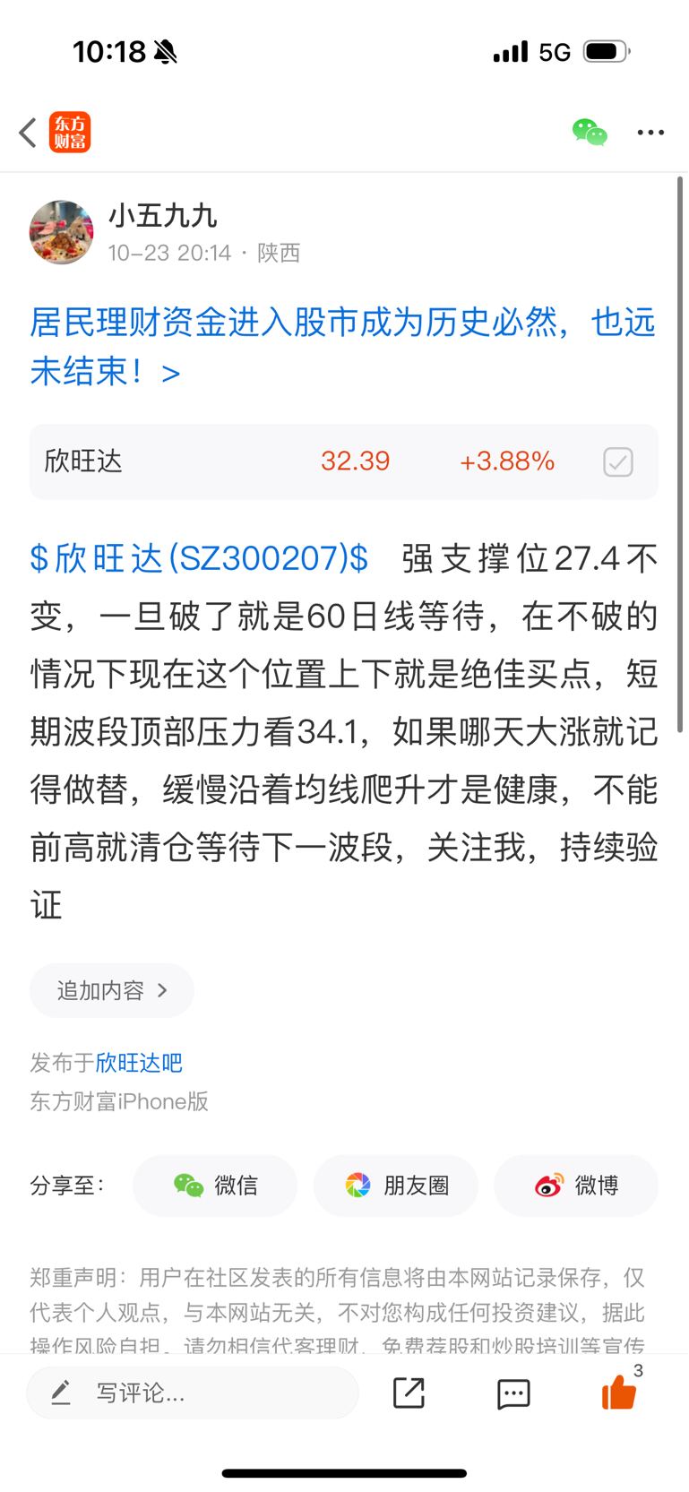 $欣旺达(SZ300207)$ 从发帖说是最佳买点位置,一路小涨、但也慢慢接近压力位了,注意落袋,或者跟随大盘趋势留小仓去博一下也行,我会选择落袋,因为好票有很多