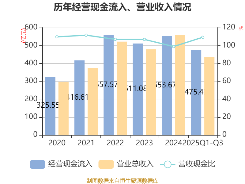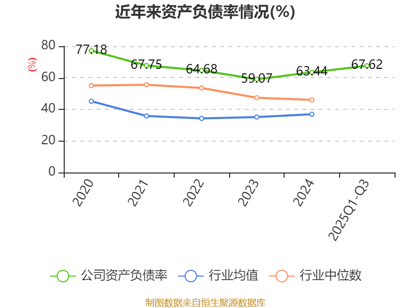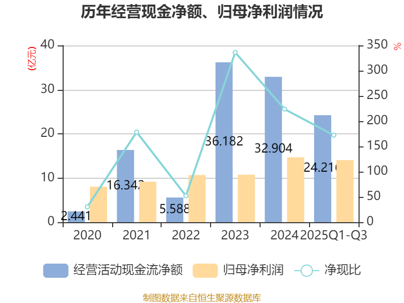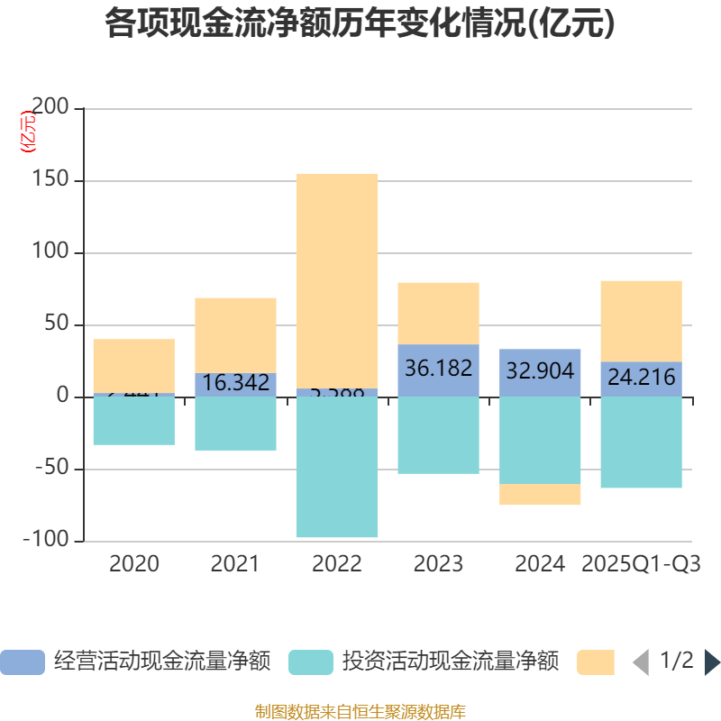 2025年前三季度,公司经营活动现金流净额为24.22亿元,同比下降7.46%;筹资活动现金流净额55.93亿元,同比增加68.78亿元;投资活动现金流净额-63.34亿元,上年同期为-47.46亿元。