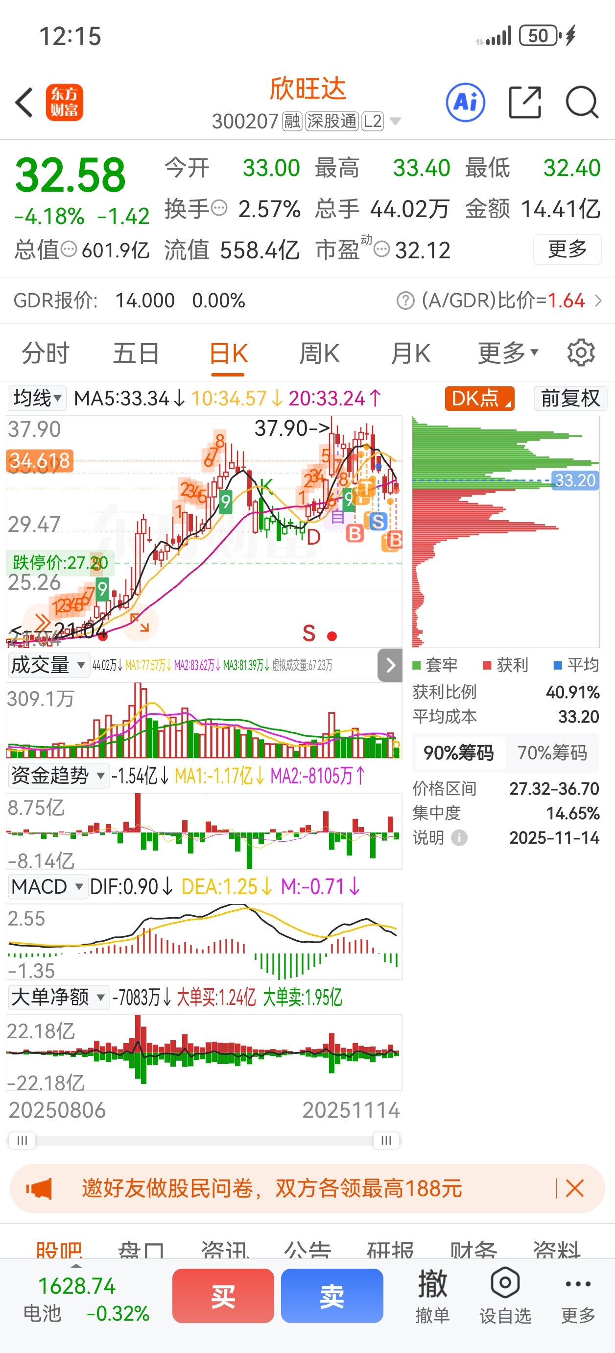 $欣旺达(SZ300207)$ 前面赚钱没走,昨天接近回本也没走,今天大面。