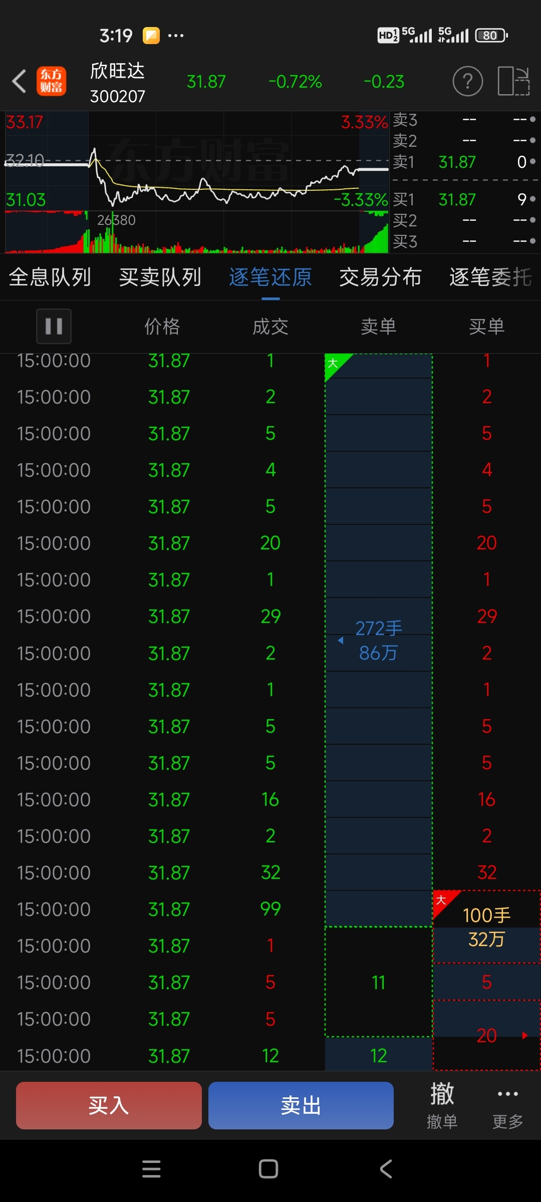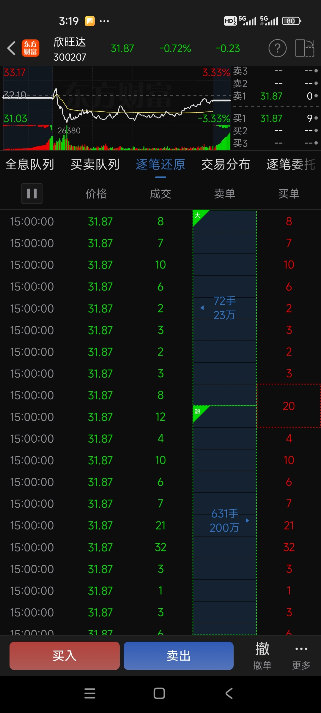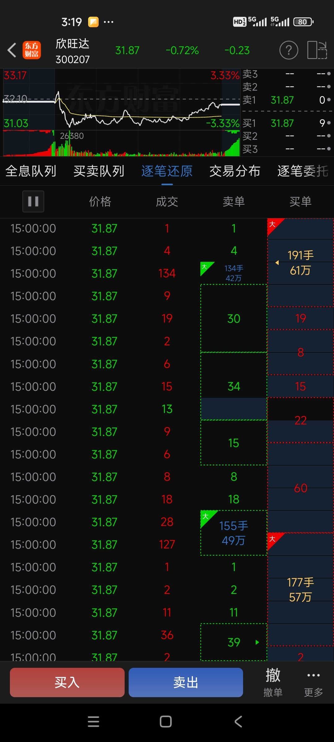 $欣旺达(SZ300207)$ 今天下午诱多卖出,一边小单子拉升大单子砸卖出,表面股价拉升上去其实主力一直卖出,明天不会给买入解套