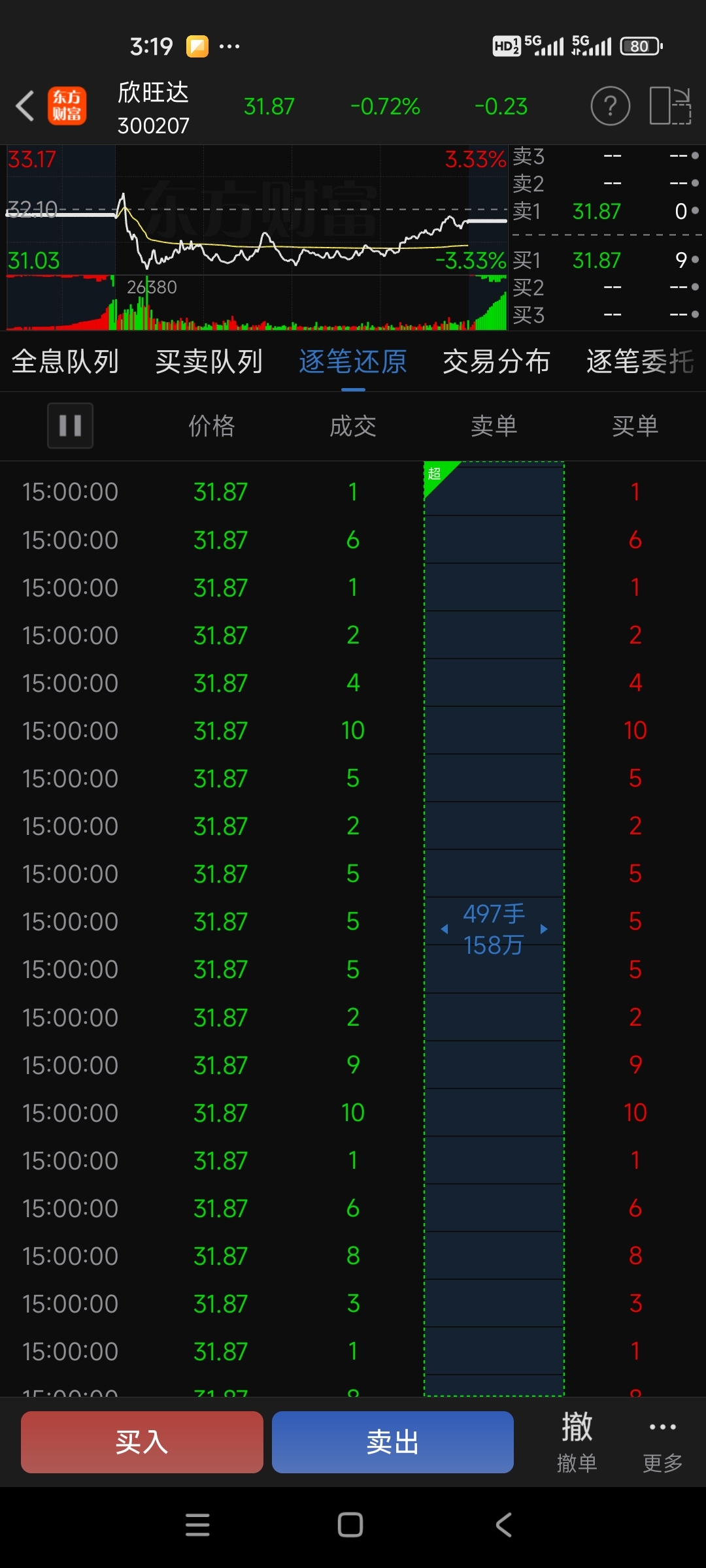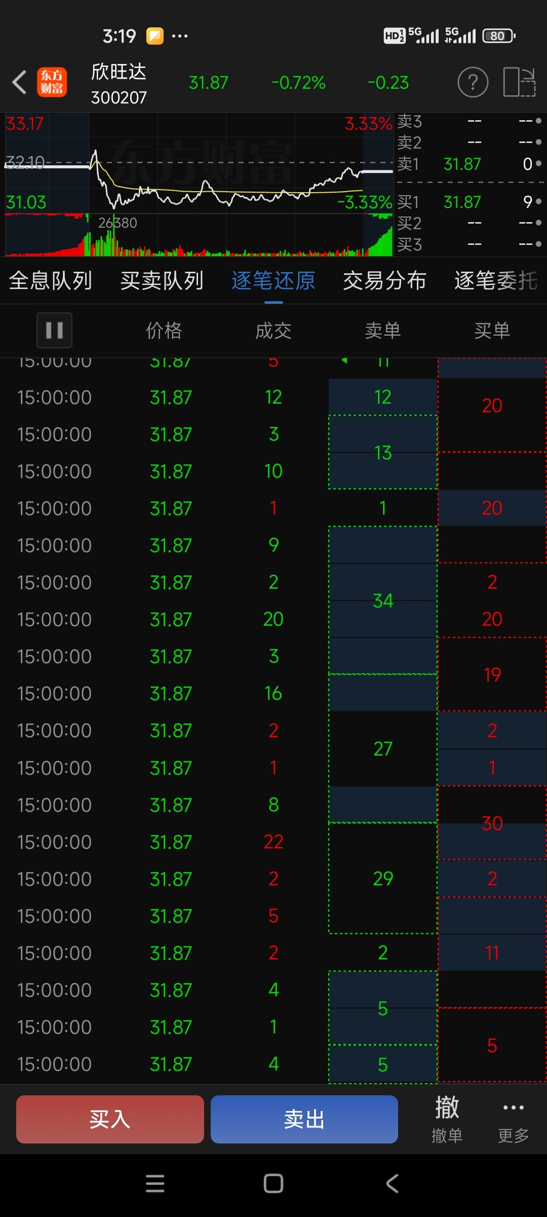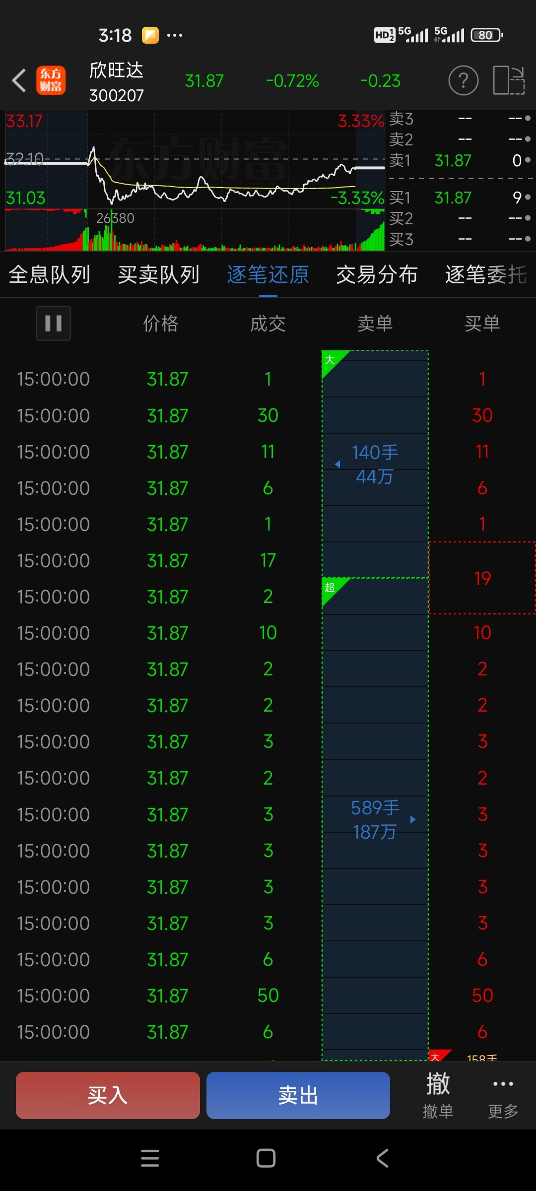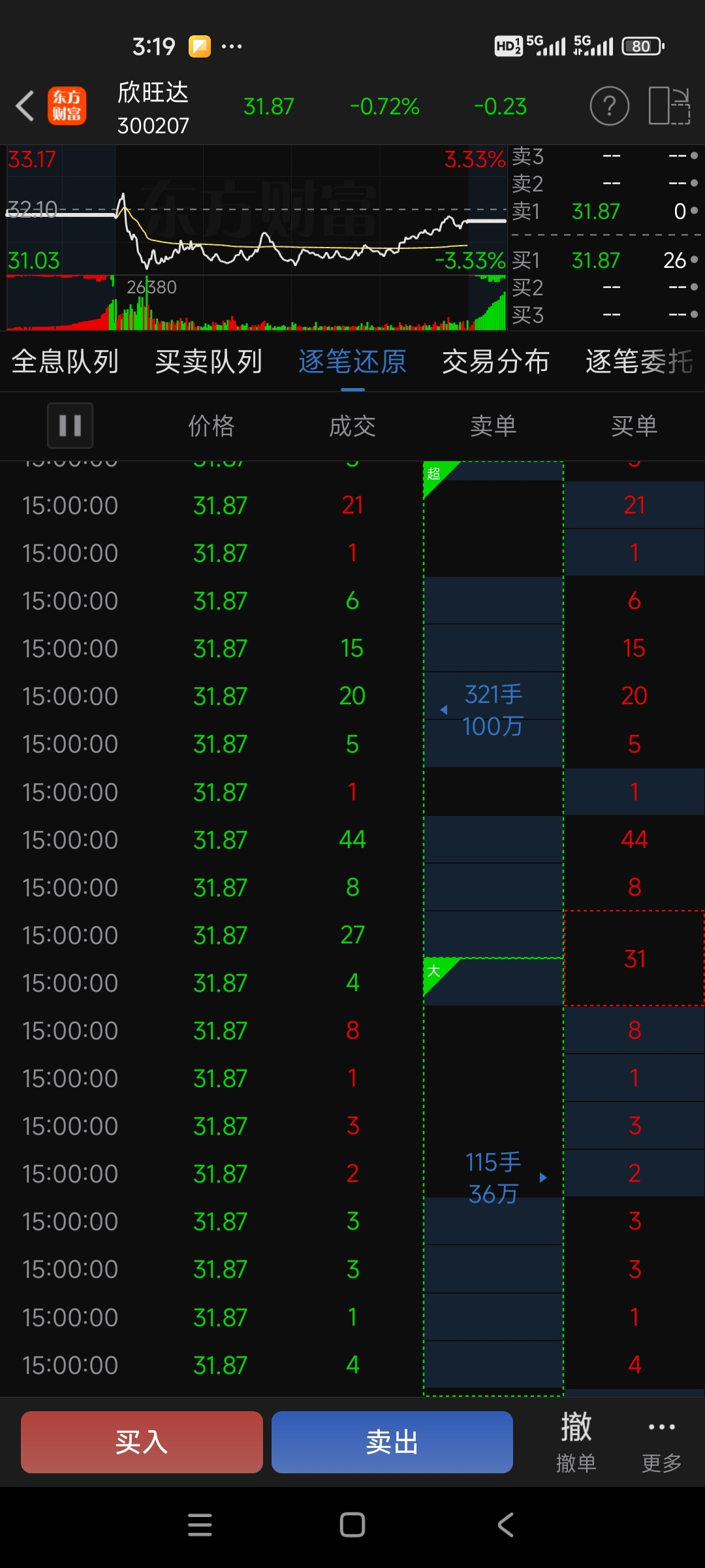 $欣旺达(SZ300207)$ 今天下午诱多卖出,一边小单子拉升大单子砸卖出,表面股价拉升上去其实主力一直卖出,明天不会给买入解套