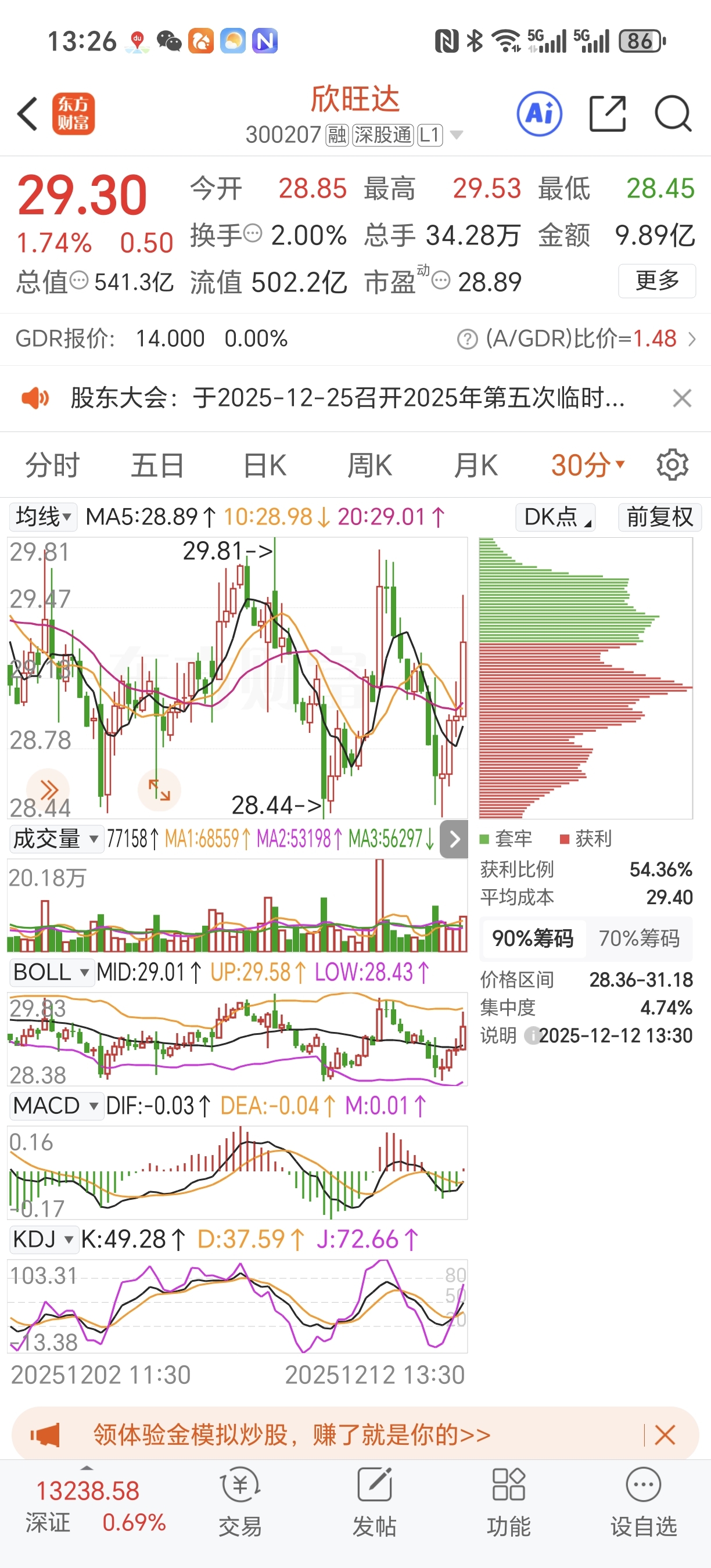 $欣旺达(SZ300207)$ 30分钟BOLL线,到顶下,到底上,真规律,看懂了就是不敢去做T,怕来个意外