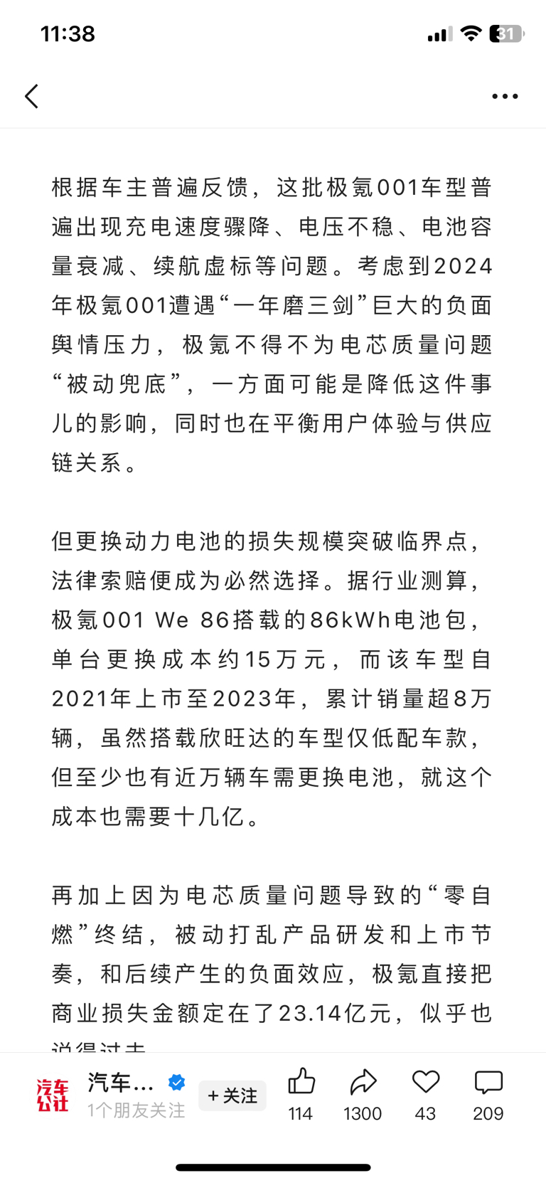 $欣旺达(SZ300207)$ 按这个说法这两年多用在吉利汽车上欣旺达的电芯都有问题呗,欣旺达管理层你们眼瞎吗,已经黑到这样,都逼到这份上了,还不跟它搏命啊,这哪是诋毁,这是要你们的命啊,还近万个电芯有问题,这不就是张嘴就来啊