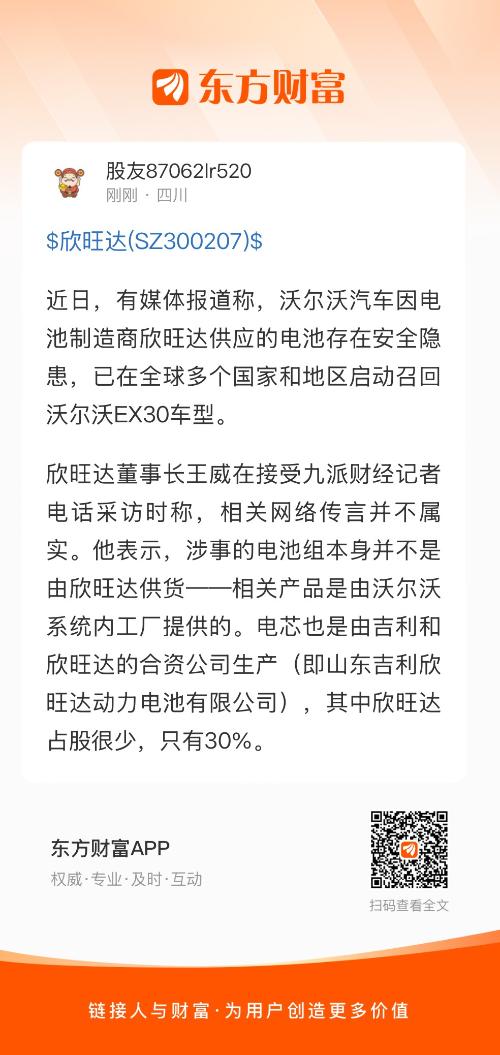 欣旺达董事长王威在接受九派财经记者电话采访时称,相关网络传言并不属实。他表示,涉事的电池组本身并不是由欣旺达供货——相关产品是由沃尔沃系统内工厂提供的。电芯也是由吉利和欣旺达的合资公司生产(即山东吉利欣旺达动力电池有限公司),其中欣旺达占股很少,只有30%。