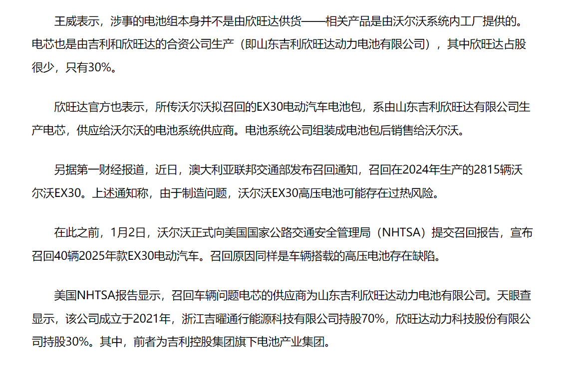 欣旺达官方也表示,所传沃尔沃拟召回的EX30电动汽车电池包,系由山东吉利欣旺达有限公司生产电芯,供应给沃尔沃的电池系统供应商。电池系统公司组装成电池包后销售给沃尔沃。