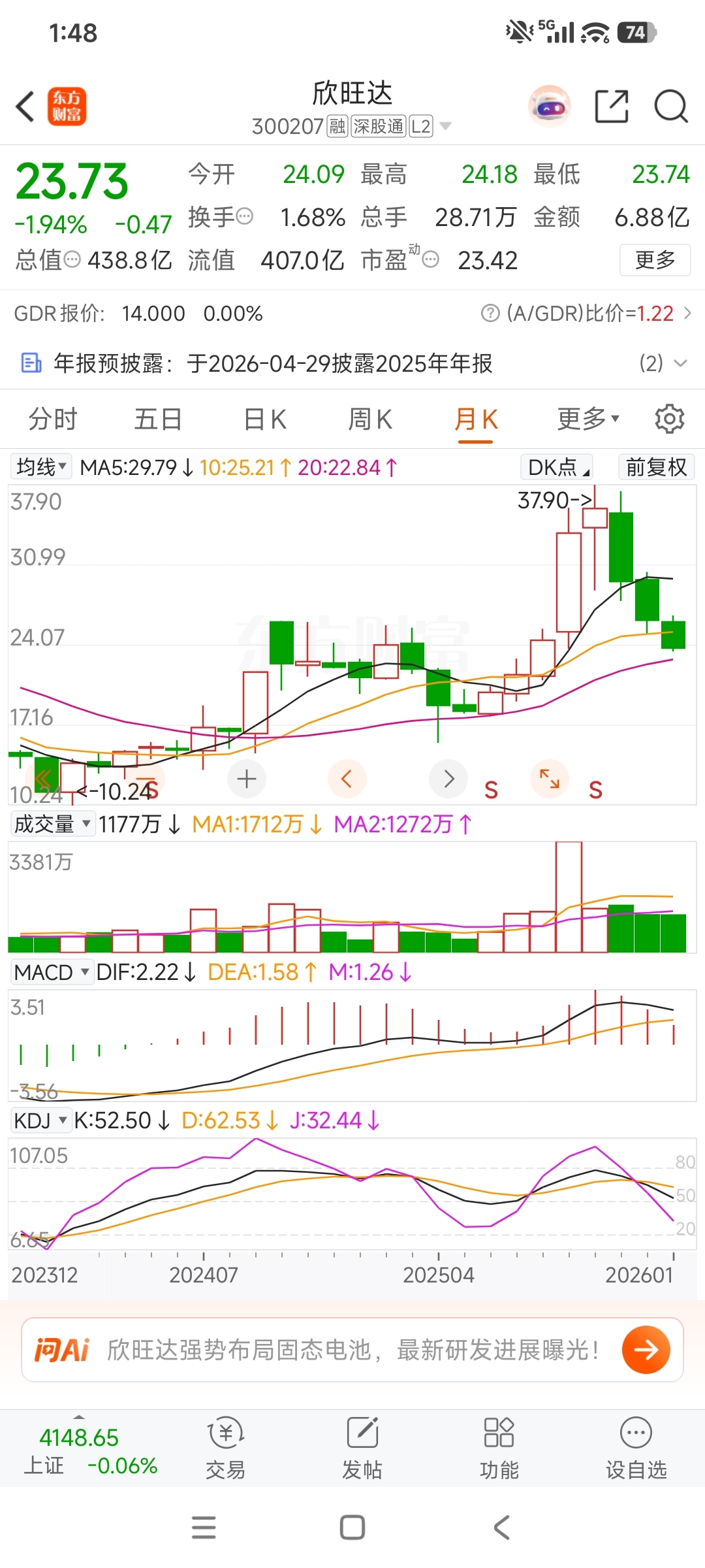 $欣旺达(SZ300207)$ 月线三根巨阴线,要到23去了