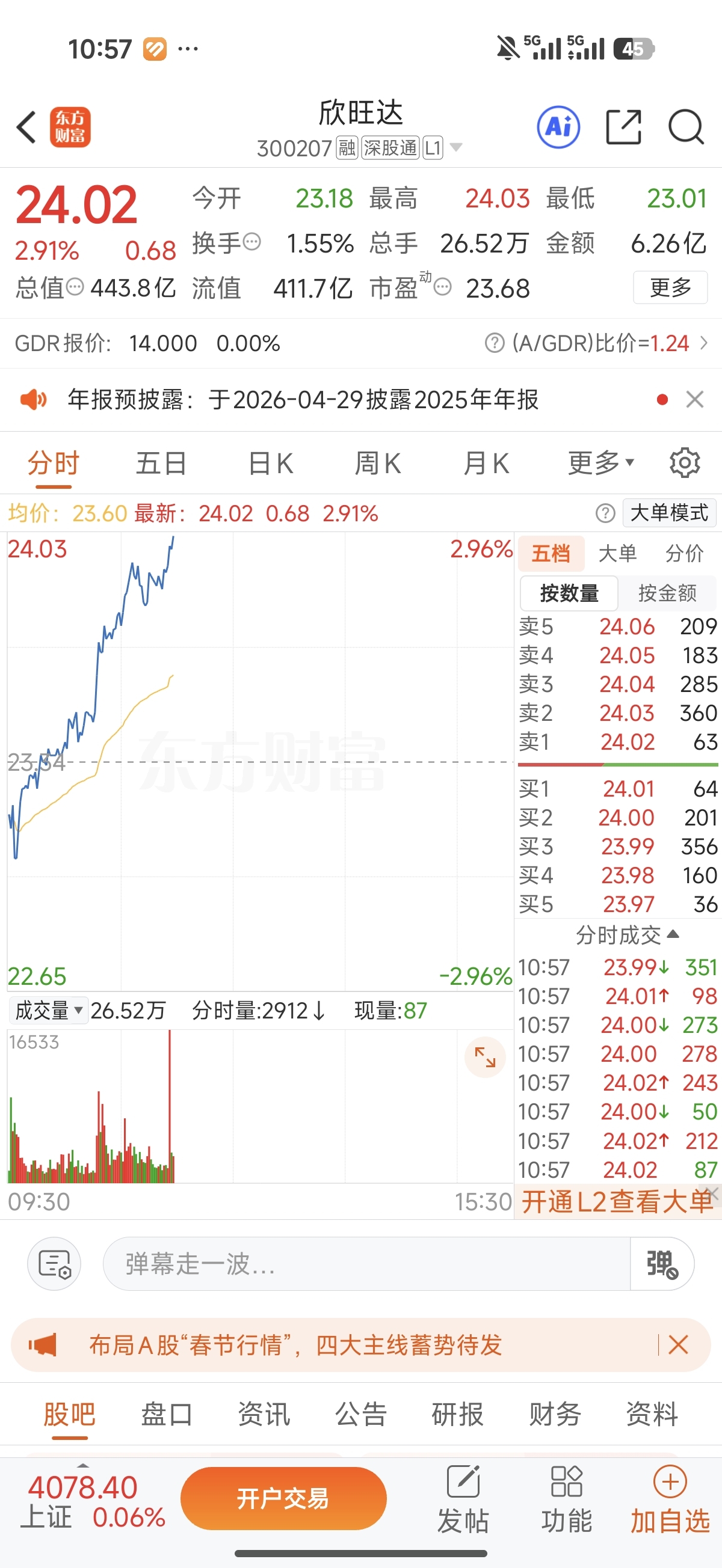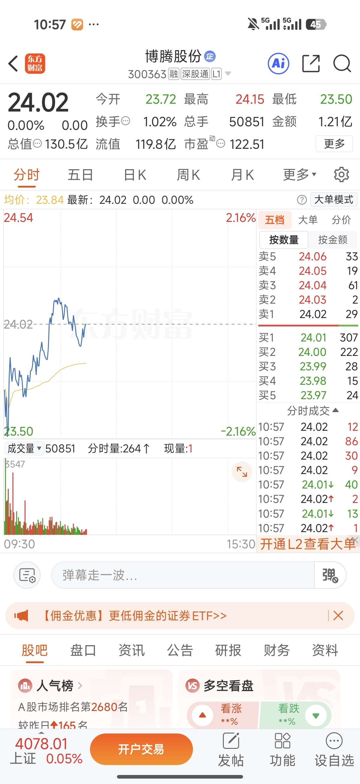 $欣旺达(SZ300207)$ $博腾股份(SZ300363)$ 周五中午价格一样,来个比赛吧,看谁先到30,今年都上50应该问题不大!给力吧!正能量!加油吧!英雄!