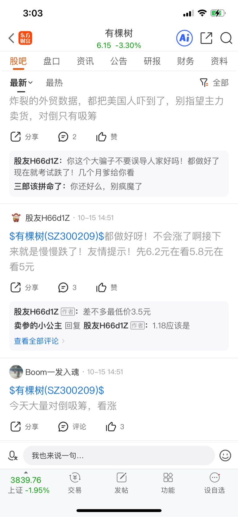 $有棵树(SZ300209)$ 第一天开跌我说要跌倒6.20元)哪几个人说我脑子有问题说出吃错药了!我几个人出来呀