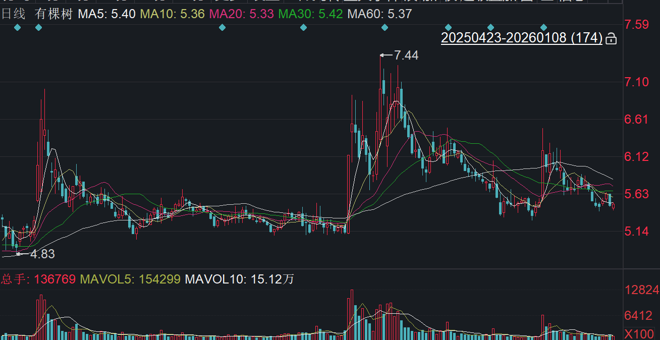 二级市场上,截至1月8日收盘,有棵树上涨0.55%报5.49元/股,总市值约50.98亿元,近一年公司股价累计上涨约14%。