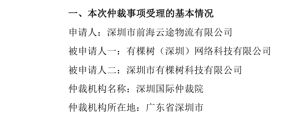 1月8日晚间,有棵树(300209)发布公告称,仲裁院受理了前海云途与公司控股子公司有棵树科技、深圳有棵树关于《国际物流服务合同》相关事项的仲裁。有棵树科技、深圳有棵树为被申请人,涉案金额9640.79万元。