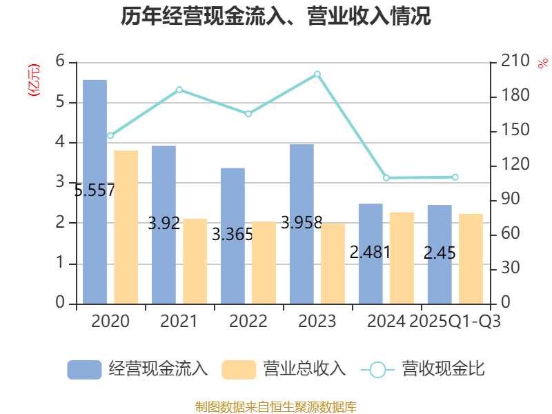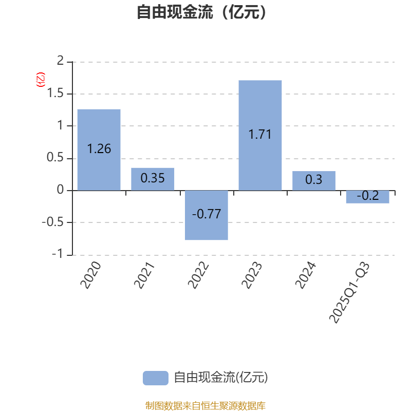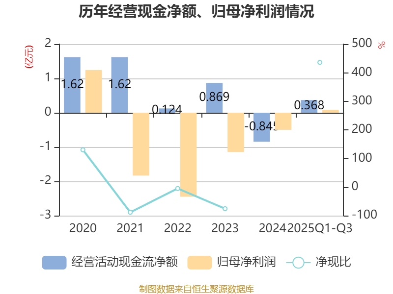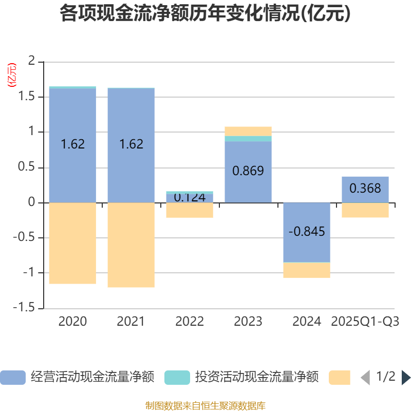 2025年前三季度,公司经营活动现金流净额为3679.14万元,同比增长154.21%;筹资活动现金流净额-2066.97万元,同比增加1.01亿元;投资活动现金流净额-45.44万元,上年同期为-29.11万元。