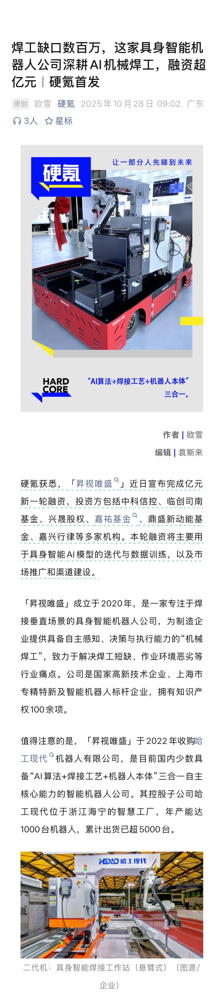 中科信控领投昇视唯盛,人工智能机器人制造公司