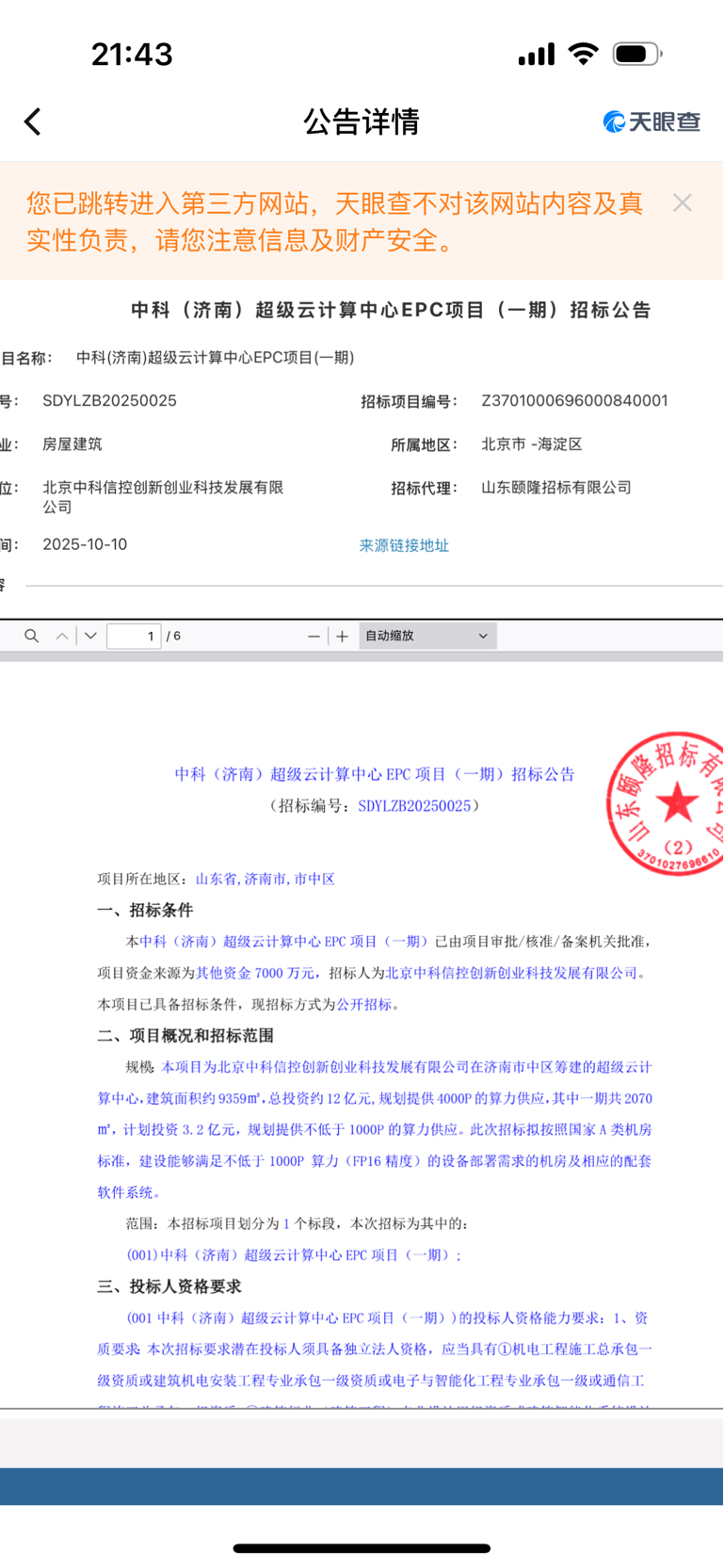 中科(济南)超级云计算中心EPC项目(一期)招标投资10个亿,结合分公司招聘的机