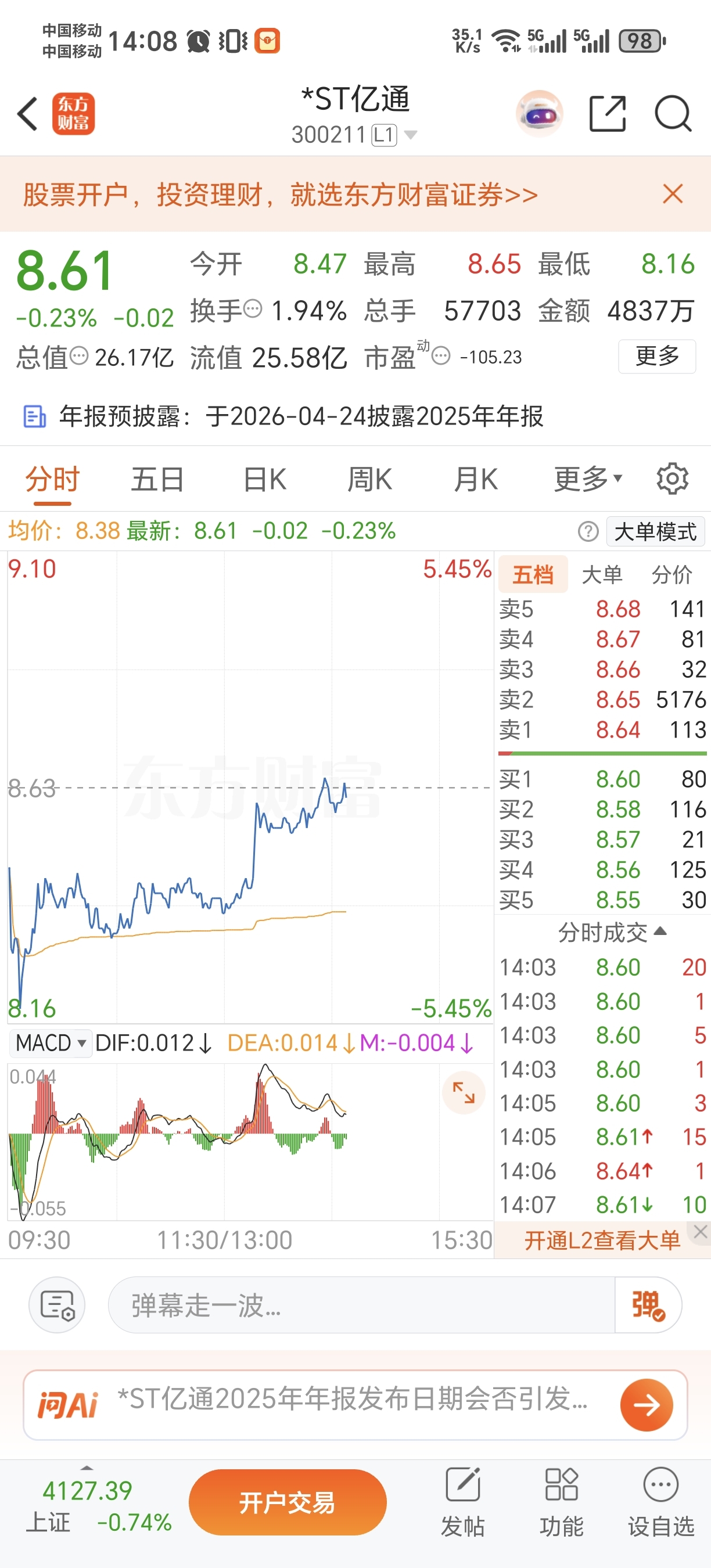 $*ST亿通(SZ300211)$ 5000手8.65,这是什么意思?