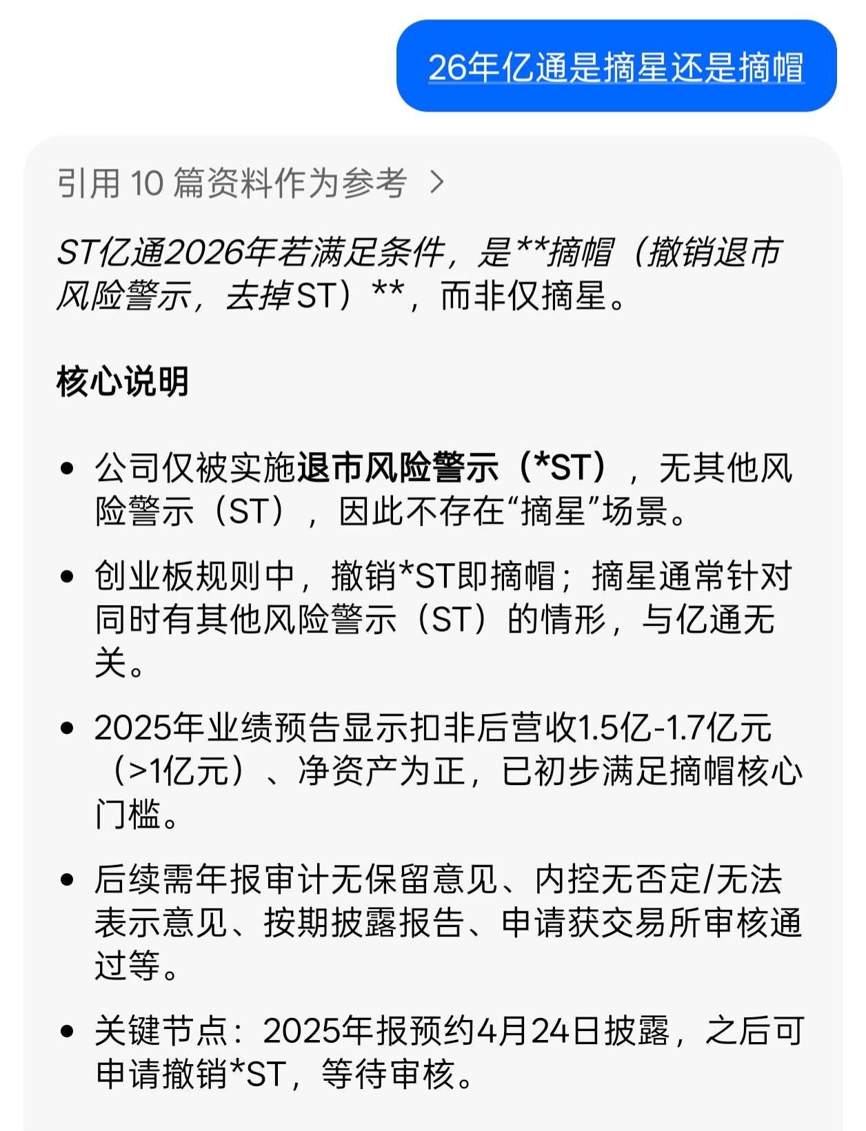 $*ST亿通(SZ300211)$ 我问的豆包直接摘帽