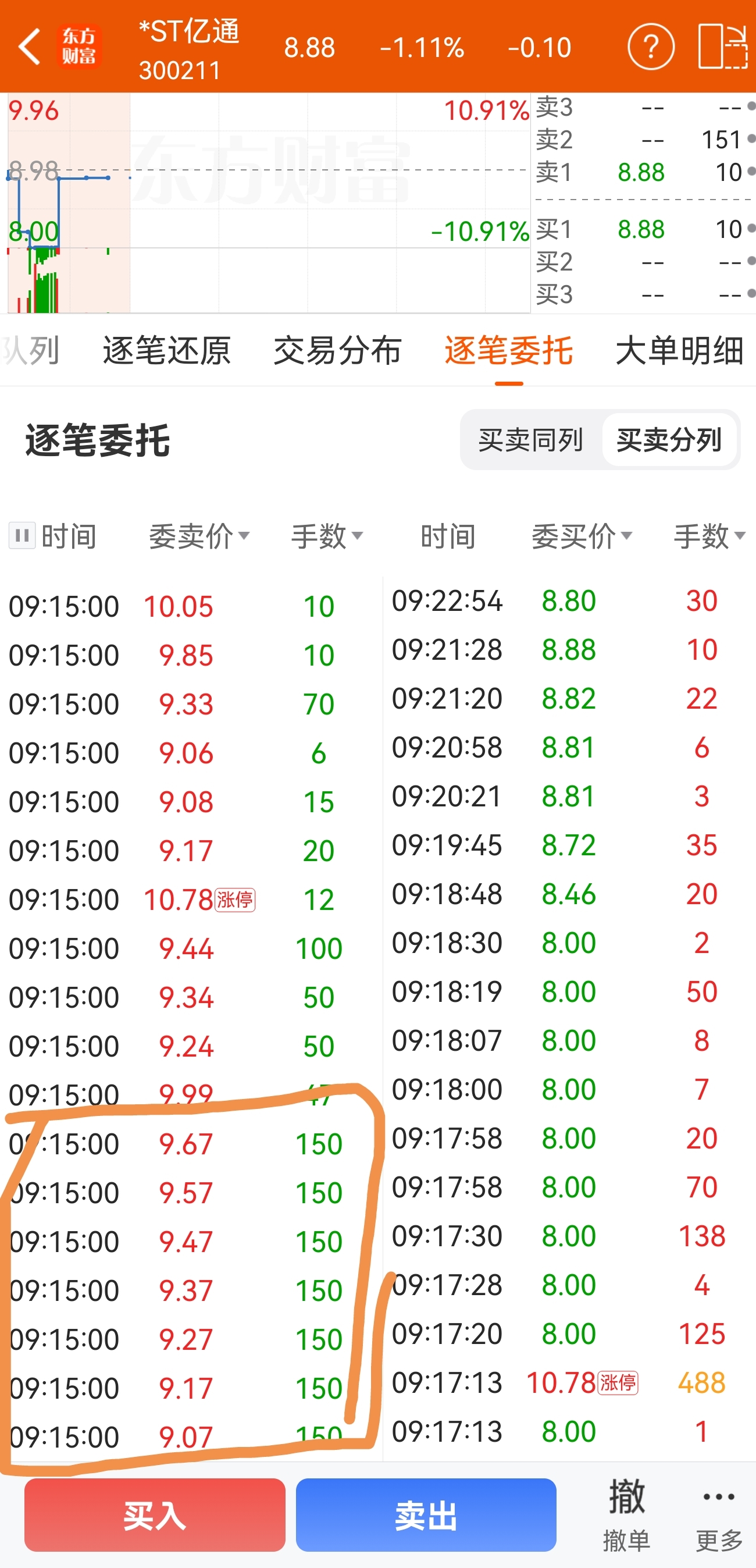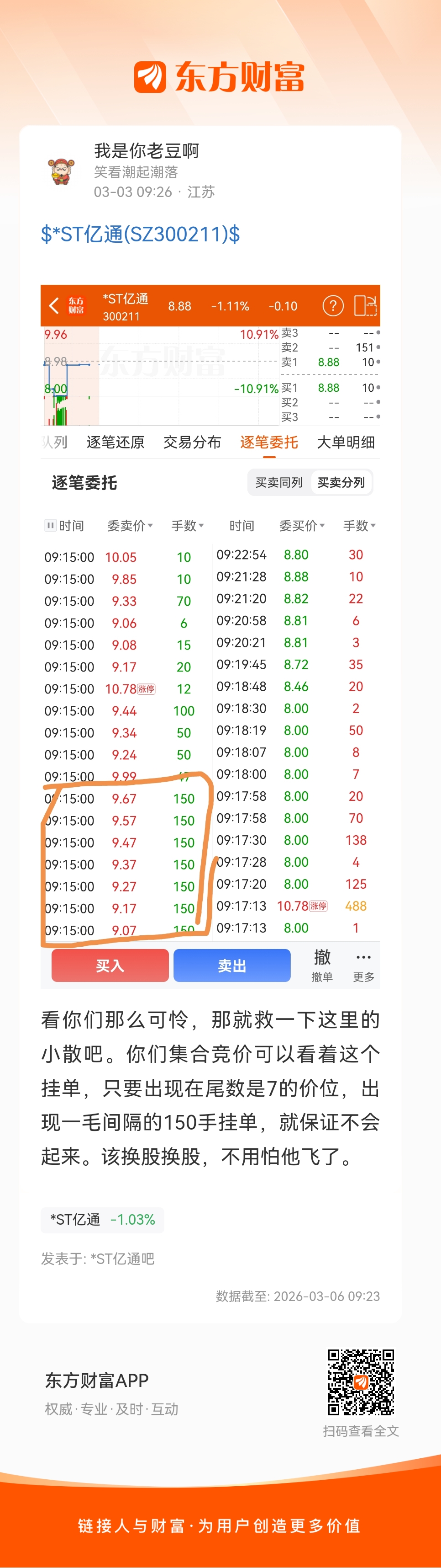 看你们那么可怜,那就救一下这里的小散吧。你们集合竞价可以看着这个挂单,只要出现在尾数是7的价位,出现一毛间隔的150手挂单,就保证不会起来。该换股换股,不用怕他飞了。