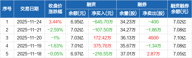 融资方面,当日融资买入1554.41万元,融资偿还2200.11万元,融资净偿还645.7万元。融券方面,融券卖出1.09万股,融券偿还1.13万股,融券余量34.23万股,融券余额679.81万元。融资融券余额合计7.02亿元。