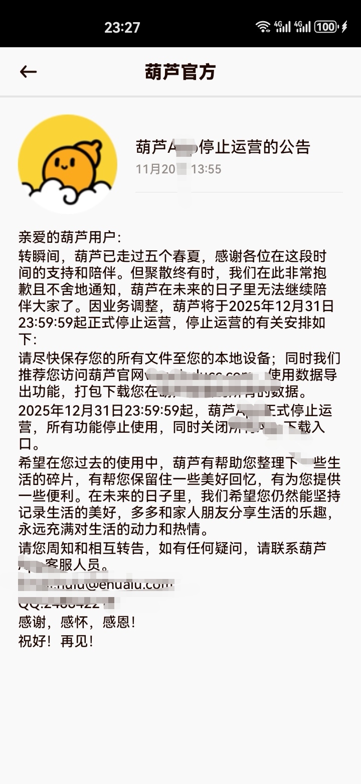 没有信用的企业:葫芦12月31日停止运行。用户数据打包下载难于上青天。
