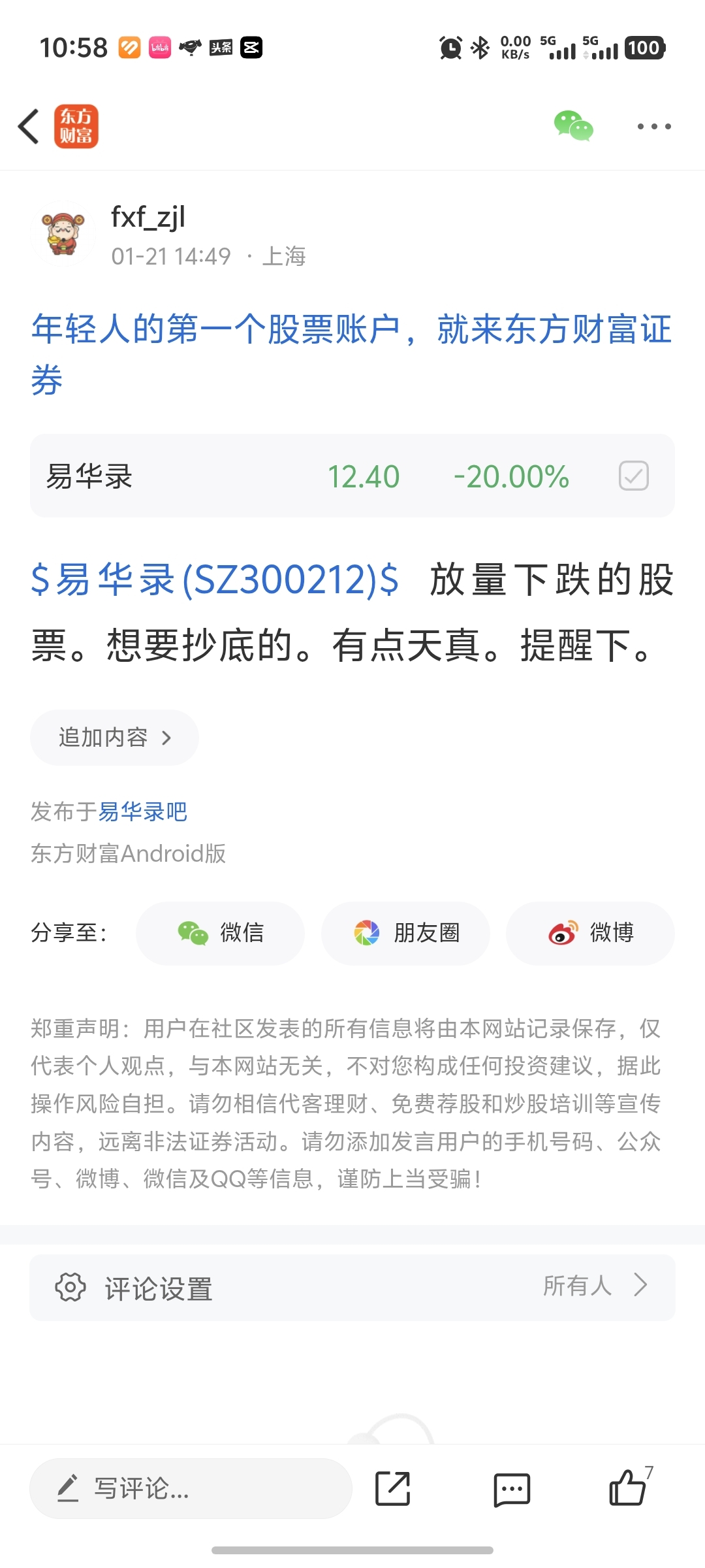 温馨提示: 1.根据《证券法》规定,禁止编造、传播虚假信息或者误导性信息,扰乱证券市场;2.用户在本社区发表的所有资料、言论等仅代表个人观点,与本网站立场无关,不对您构成任何投资建议。用户应基于自己的独立判断,自行决定证券投资并承担相应风险。《东方财富社区管理规定》